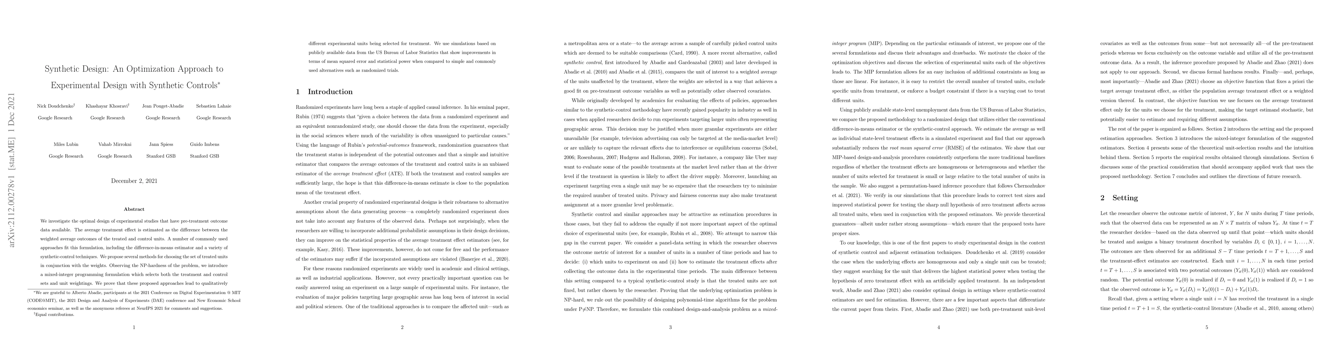 This paper proposes optimization methods for designing experimental studies using synthetic controls, addressing the NP-hard problem of selecting treatment and control units and their weights. Simulation results show improved mean squared error and statistical power compared to traditional methods.