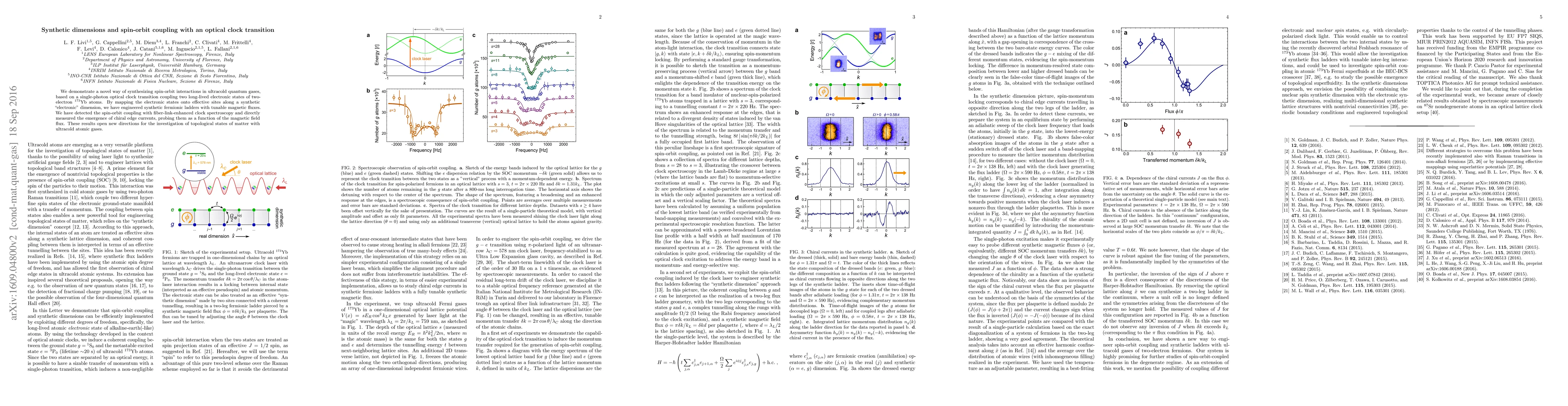 This paper demonstrates a novel method to synthesize spin-orbit interactions in ultracold quantum gases using an optical clock transition in $^{173}$Yb atoms. The study engineered synthetic fermionic ladders with tunable magnetic fluxes and detected spin-orbit coupling via enhanced clock spectroscopy, revealing chiral edge currents.