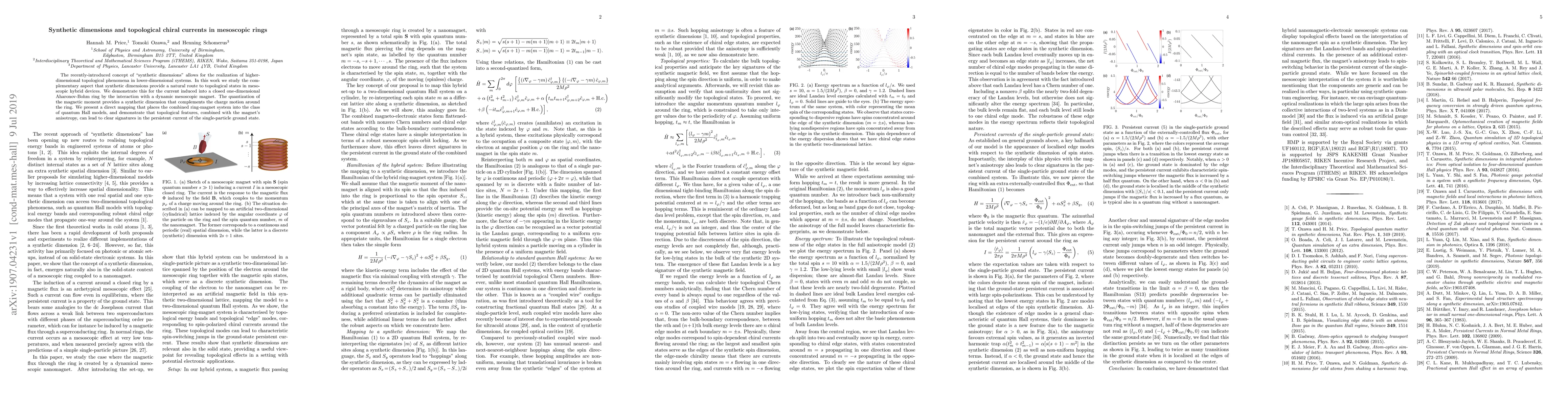 The recently-introduced concept of "synthetic dimensions" allows for the realization of higher-dimensional topological phenomena in lower-dimensional systems. In this work we study the complementary aspect that synthetic dimensions provide a natural route to topological states in mesoscopic hybrid devices. We demonstrate this for the current induced into a closed one-dimensional Aharonov-Bohm ring by the interaction with a dynamic mesoscopic magnet. The quantization of the magnetic moment provides a synthetic dimension that complements the charge motion around the ring. We present a direct mapping that places the combined ring-magnet system into the class of quantum Hall models, and demonstrate that topological features, combined with the magnet's anisotropy, can lead to clear signatures in the persistent current of the single-particle ground state.