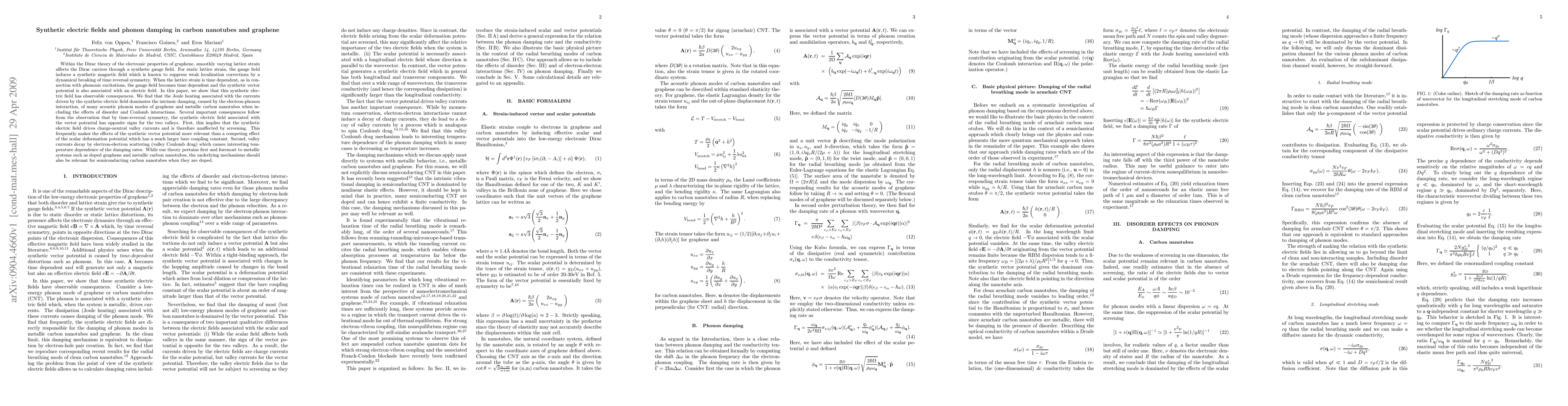 Smoothly varying lattice strain in graphene affects the Dirac carriers through a synthetic gauge field. When the lattice strain is time dependent, as in connection with phononic excitations, the gauge field becomes time dependent and the synthetic vector potential is also associated with an electric field. We show that this synthetic electric field has observable consequences. Joule heating associated with the currents driven by the synthetic electric field dominates the intrinsic damping, caused by the electron-phonon interaction, of many acoustic phonon modes of graphene and metallic carbon nanotubes when including the effects of disorder and Coulomb interactions. Several important consequences follow from the observation that by time-reversal symmetry, the synthetic electric field associated with the vector potential has opposite signs for the two valleys. First, this implies that the synthetic electric field drives charge-neutral valley currents and is therefore unaffected by screening. This frequently makes the effects of the synthetic vector potential more relevant than a competing effect of the scalar deformation potential which has a much larger bare coupling constant. Second, valley currents decay by electron-electron scattering (valley Coulomb drag) which causes interesting temperature dependence of the damping rates. While our theory pertains first and foremost to metallic systems such as doped graphene and metallic carbon nanotubes, the underlying mechanisms should also be relevant for semiconducting carbon nanotubes when they are doped.
