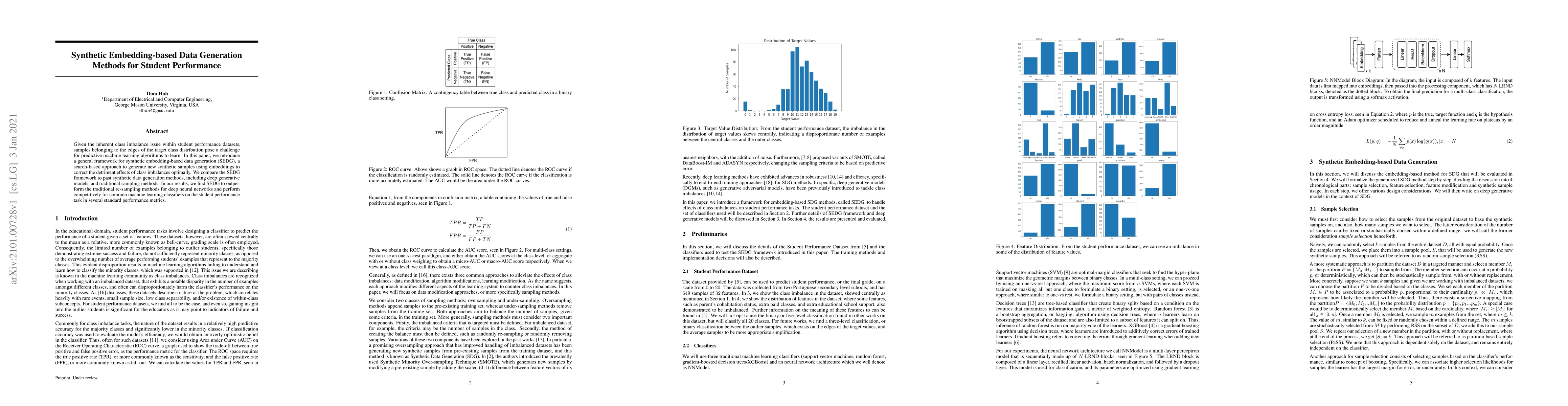 This paper introduces SEDG, a synthetic embedding-based data generation framework to address class imbalance in student performance datasets. SEDG outperforms traditional re-sampling methods for deep neural networks and is competitive for common machine learning classifiers.