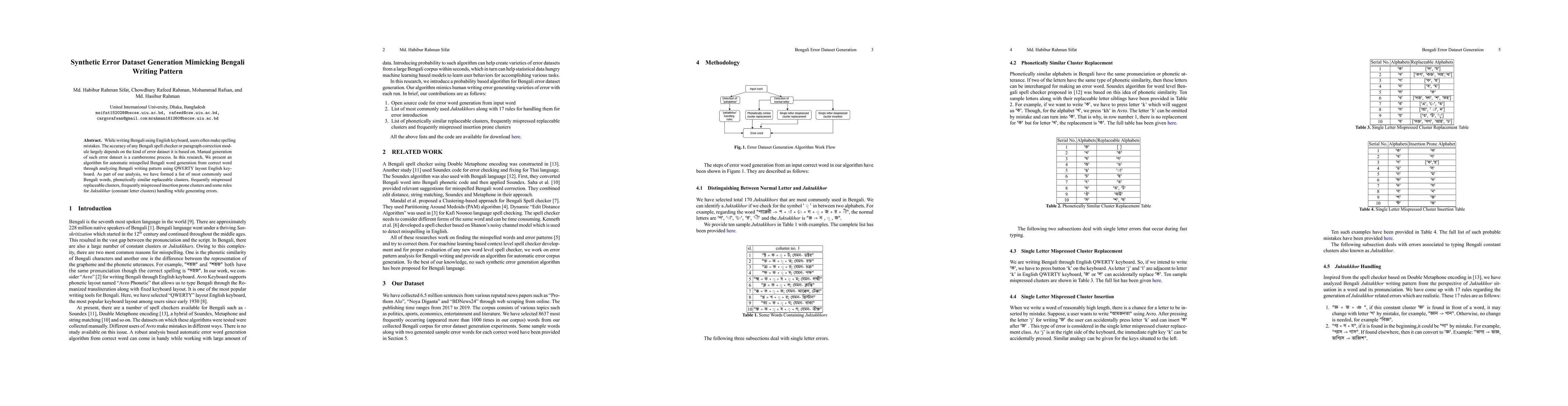This paper proposes an algorithm for automatically generating synthetic error datasets for Bengali spell checkers by mimicking common writing mistakes made when typing Bengali on an English keyboard. The algorithm analyzes Bengali writing patterns and uses rules to create phonetic and mispress errors based on frequently used words and clusters.
