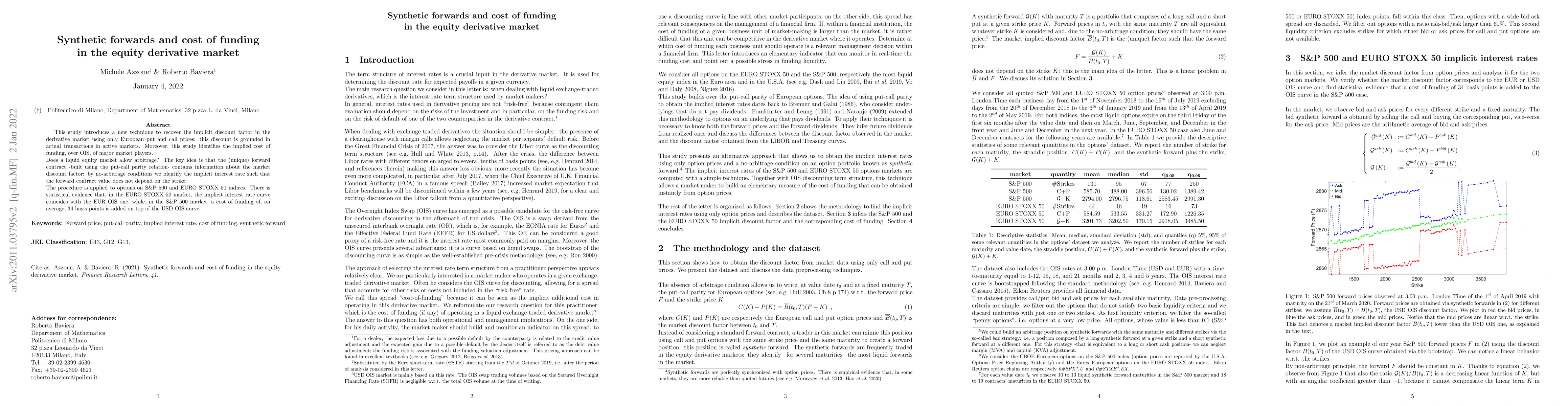 This study introduces a new technique to recover the implicit discount factor in the derivative market using only European put and call prices: this discount is grounded in actual transactions in active markets. Moreover, this study identifies the implied cost of funding, over OIS, of major market players. Does a liquid equity market allow arbitrage? The key idea is that the (unique) forward contract -- built using the put-call parity relation -- contains information about the market discount factor: by no-arbitrage conditions we identify the implicit interest rate such that the forward contract value does not depend on the strike. The procedure is applied to options on S&P 500 and EURO STOXX 50 indices. There is statistical evidence that, in the EURO STOXX 50 market, the implicit interest rate curve coincides with the EUR OIS one, while, in the S&P 500 market, a cost of funding of, on average, 34 basis points is added on top of the USD OIS curve.