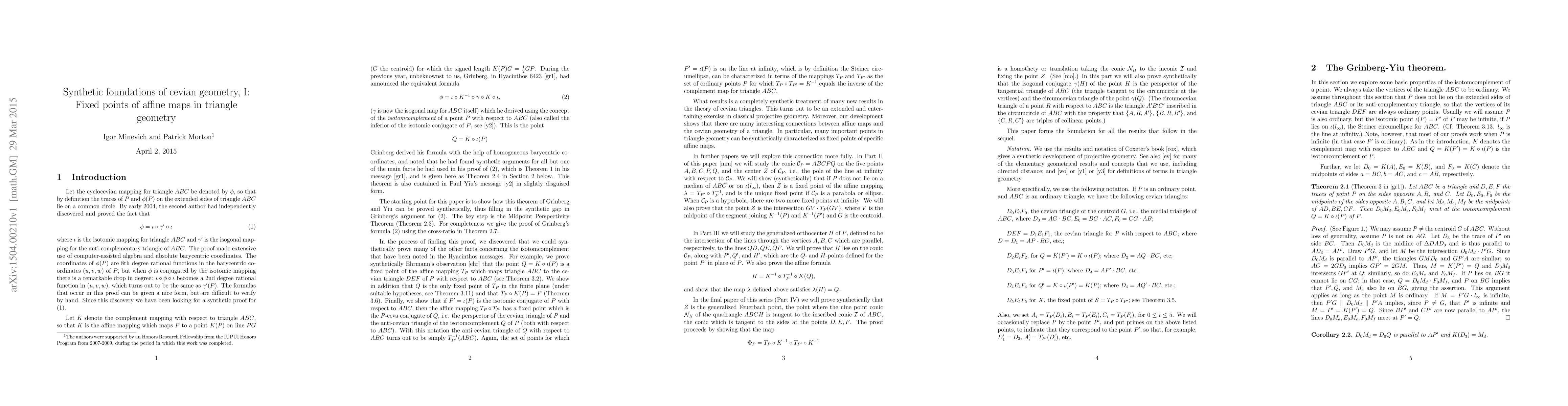 We give synthetic proofs of many new results in triangle geometry, focusing especially on fixed points of certain affine maps which are defined in terms of the cevian triangle $DEF$ of a point $P$ with respect to a given triangle $ABC$, as well as the cevian triangle of the isotomic conjugate $P'$ of $P$ with respect to $ABC$. We prove a formula for the cyclocevian map in terms of the isotomic and isogonal maps using an entirely synthetic argument, and show that the complement $Q$ of the isotomic conjugate $P'$ has many interesting properties. If $T_P$ is the affine map taking $ABC$ to $DEF$, we show synthetically that $Q$ is the unique ordinary fixed point of $T_P$ when $P$ is any point not lying on the sides of triangle $ABC$, its anti-complementary triangle, or the Steiner circumellipse of $ABC$. We also show that $T_P(Q')=P$ if $Q'$ is the complement of $P$, and that the affine map $T_P T_{P'}$ is either a homothety or a translation which always has the $P$-ceva conjugate of $Q$ as a fixed point. Finally, we show that $P$ lies on the Steiner circumellipse if and only if $T_PT_{P'}=K^{-1}$, where $K$ is the complement map for $ABC$. This paper forms the foundation for several more papers to follow, in which the conic on the 5 points $A,B,C,P,Q$ is studied and its center is characterized as a fixed point of the map $\lambda=T_{P'} T_P^{-1}$.