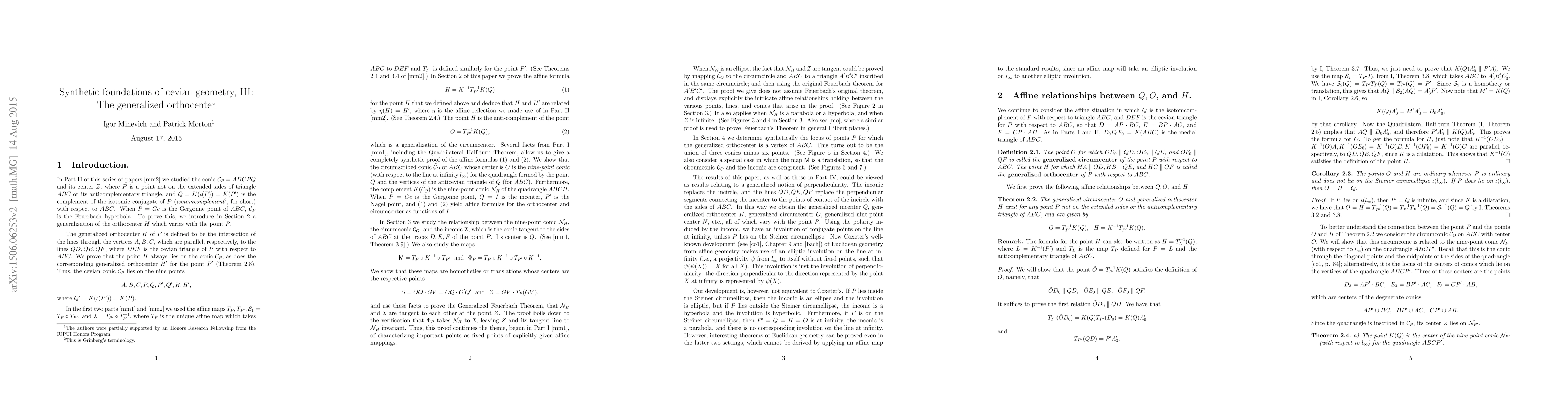 In this paper, the third in the series, we define the generalized orthocenter $H$ corresponding to a point $P$, with respect to triangle $ABC$, as the unique point for which the lines $HA, HB, HC$ are parallel, respectively, to $QD, QE, QF$, where $DEF$ is the cevian triangle of $P$ and $Q=K \circ \iota(P)$ is the $isotomcomplement$ of $P$, both with respect to $ABC$. We prove a generalized Feuerbach Theorem, and characterize the center $Z$ of the cevian conic $\mathcal{C}_P$, defined in Part II, as the center of the affine map $\Phi_P = T_P \circ K^{-1} \circ T_{P'} \circ K^{-1}$, where $T_P$ is the unique affine map for which $T_P(ABC)=DEF$; $T_{P'}$ is defined similarly for the isotomic conjugate $P'=\iota(P)$ of $P$; and $K$ is the complement map. The affine map $\Phi_P$ fixes $Z$ and takes the nine-point conic $\mathcal{N}_H$ for the quadrangle $ABCH$ (with respect to the line at infinity) to the inconic $\mathcal{I}$, defined to be the unique conic which is tangent to the sides of $ABC$ at the points $D, E, F$. The point $Z$ is therefore the point where the nine-point conic $\mathcal{N}_H$ and the inconic $\mathcal{I}$ touch. This theorem generalizes the usual Feuerbach theorem and holds in all cases where the point $P$ is not on a median, whether the conics involved are ellipses, parabolas, or hyperbolas, and also holds when $Z$ is an infinite point. We also determine the locus of points $P$ for which the generalized orthocenter $H$ coincides with a vertex of $ABC$; this locus turns out to be the union of three conics minus six points. All our proofs are synthetic, and combine affine and projective arguments.