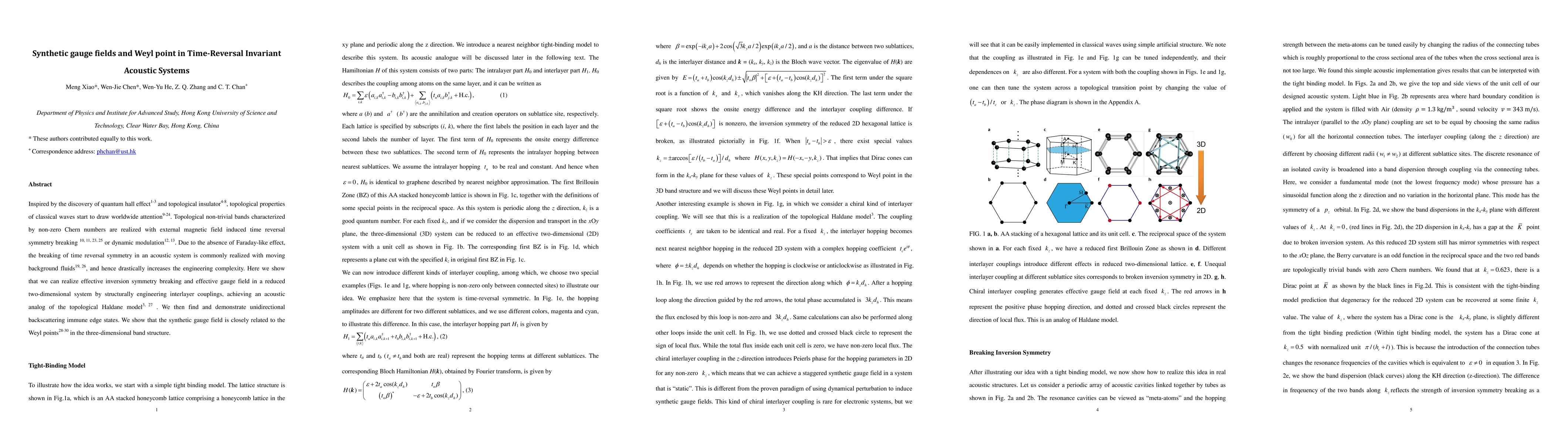 Researchers create a synthetic gauge field in an acoustic system that mimics topological properties of quantum systems, enabling unidirectional backscattering immune edge states and Weyl points.