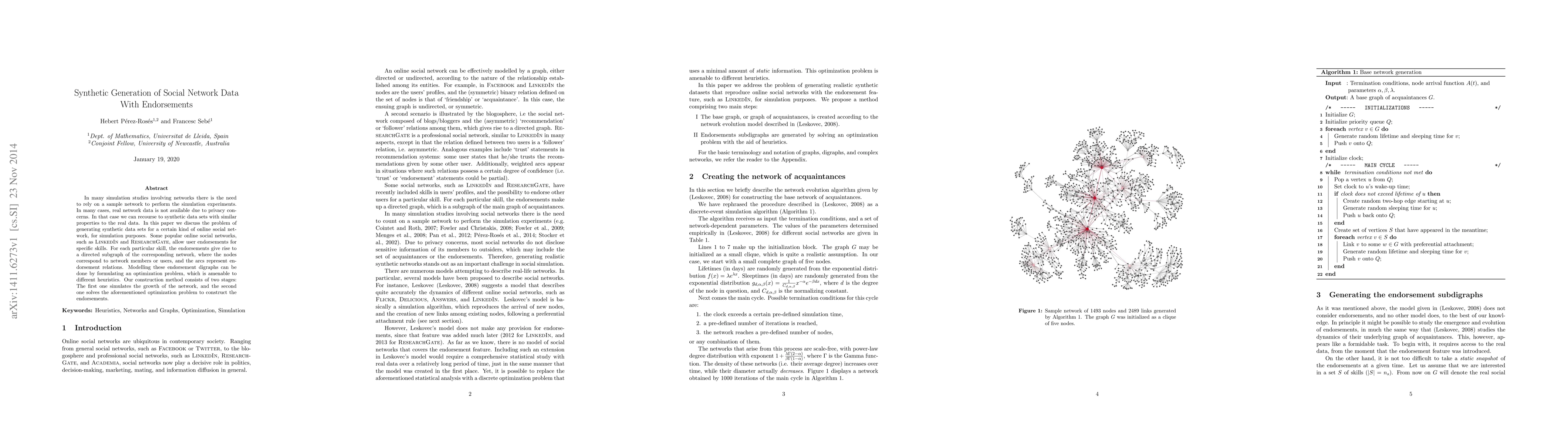 In many simulation studies involving networks there is the need to rely on a sample network to perform the simulation experiments. In many cases, real network data is not available due to privacy concerns. In that case we can recourse to synthetic data sets with similar properties to the real data. In this paper we discuss the problem of generating synthetic data sets for a certain kind of online social network, for simulation purposes. Some popular online social networks, such as LinkedIn and ResearchGate, allow user endorsements for specific skills. For each particular skill, the endorsements give rise to a directed subgraph of the corresponding network, where the nodes correspond to network members or users, and the arcs represent endorsement relations. Modelling these endorsement digraphs can be done by formulating an optimization problem, which is amenable to different heuristics. Our construction method consists of two stages: The first one simulates the growth of the network, and the second one solves the aforementioned optimization problem to construct the endorsements.