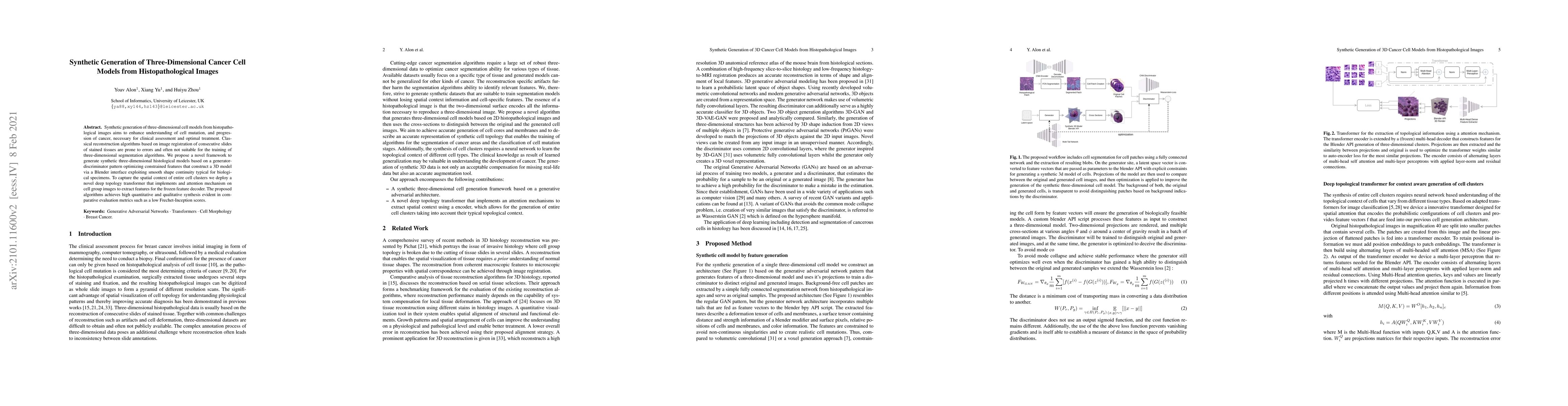 This paper proposes a novel framework for generating synthetic three-dimensional cancer cell models from histopathological images, aiming to improve cancer research and treatment. The framework uses a generator-discriminator approach with a deep topology transformer to capture spatial context, achieving high synthesis quality as evidenced by low Frechet-Inception scores.