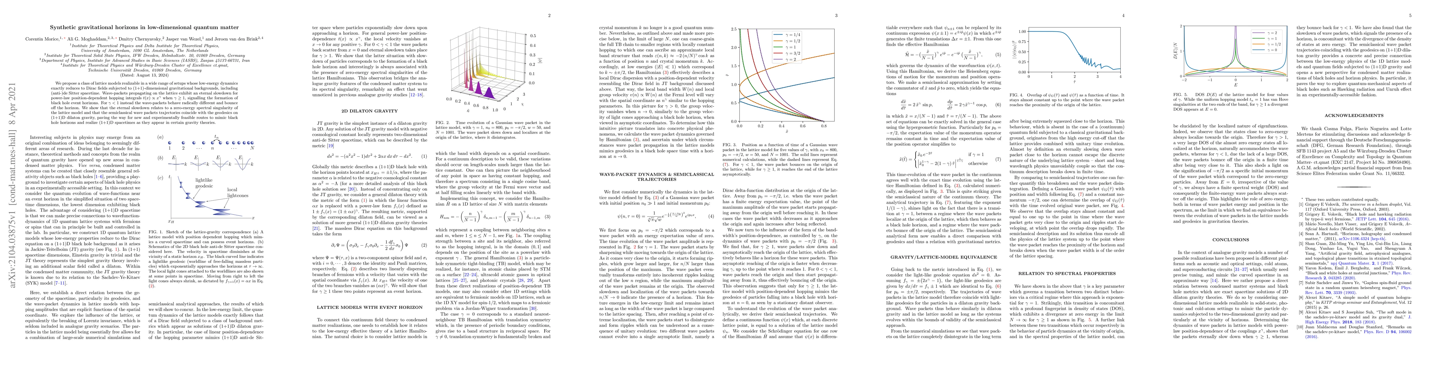 Researchers propose a lattice model that mimics black hole event horizons in low-dimensional quantum matter, with wave-packets exhibiting eternal slowdown for certain hopping integrals, and providing a new route to mimic (1+1)D spacetimes.