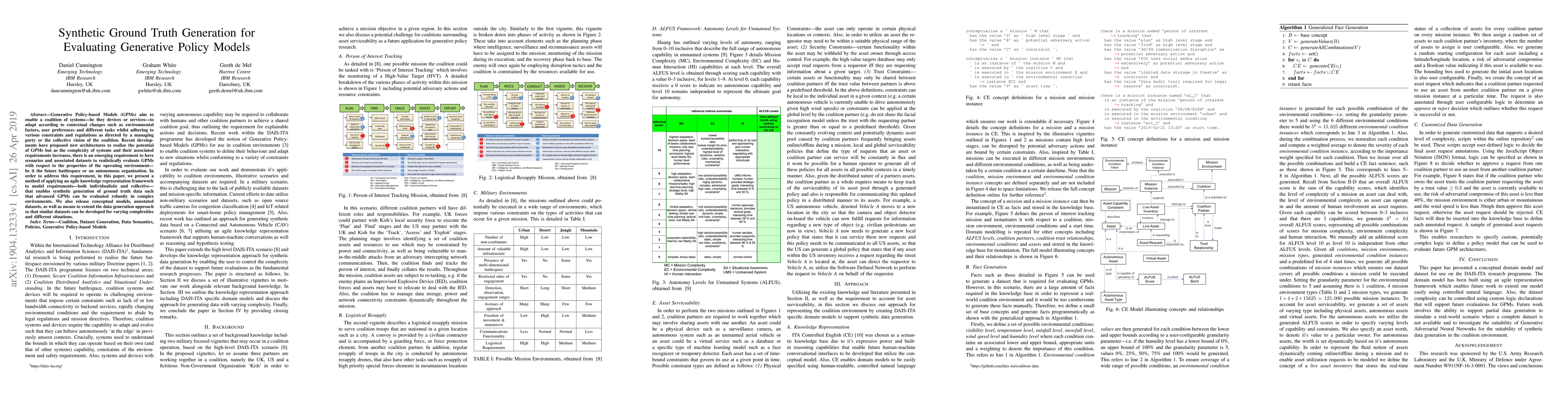 Generative Policy-based Models aim to enable a coalition of systems, be they devices or services to adapt according to contextual changes such as environmental factors, user preferences and different tasks whilst adhering to various constraints and regulations as directed by a managing party or the collective vision of the coalition. Recent developments have proposed new architectures to realize the potential of GPMs but as the complexity of systems and their associated requirements increases, there is an emerging requirement to have scenarios and associated datasets to realistically evaluate GPMs with respect to the properties of the operating environment, be it the future battlespace or an autonomous organization. In order to address this requirement, in this paper, we present a method of applying an agile knowledge representation framework to model requirements, both individualistic and collective that enables synthetic generation of ground truth data such that advanced GPMs can be evaluated robustly in complex environments. We also release conceptual models, annotated datasets, as well as means to extend the data generation approach so that similar datasets can be developed for varying complexities and different situations.