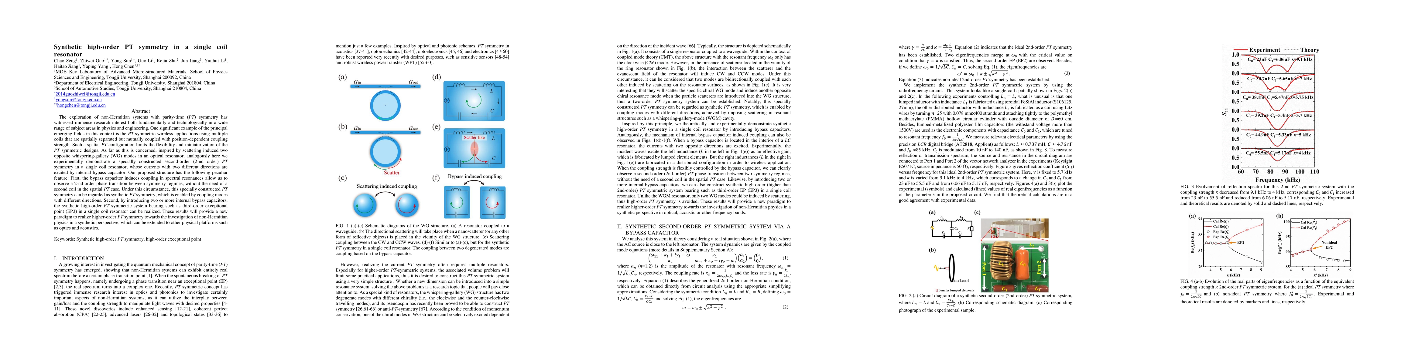The exploration of non-Hermitian systems with parity-time (PT) symmetry has witnessed immense research interest both fundamentally and technologically in a wide range of subject areas in physics and engineering. One significant example of the principal emerging fields in this context is the PT symmetric wireless applications using multiple coils that are spatially separated but mutually coupled with position-dependent coupling strength. Such a spatial PT configuration limits the flexibility and miniaturization of the PT symmetric designs. As far as this is concerned, inspired by scattering induced two opposite whispering-gallery (WG) modes in an optical resonator, analogously here we experimentally demonstrate a specially constructed second-order (2-nd order) PT symmetry in a single coil resonator, whose currents with two different directions are excited by internal bypass capacitor. Our proposed structure has the following peculiar feature: First, the bypass capacitor induces coupling in spectral resonances allow us to observe a 2-nd order phase transition between symmetry regimes, without the need of a second coil in the spatial PT case. Under this circumstance, this specially constructed PT symmetry can be regarded as synthetic PT symmetry, which is enabled by coupling modes with different directions. Second, by introducing two or more internal bypass capacitors, the synthetic high-order PT symmetric system bearing such as third-order exceptional point in a single coil resonator can be realized. These results will provide a new paradigm to realize higher-order PT symmetry towards the investigation of non-Hermitian physics in a synthetic perspective, which can be extended to other physical platforms such as optics and acoustics.