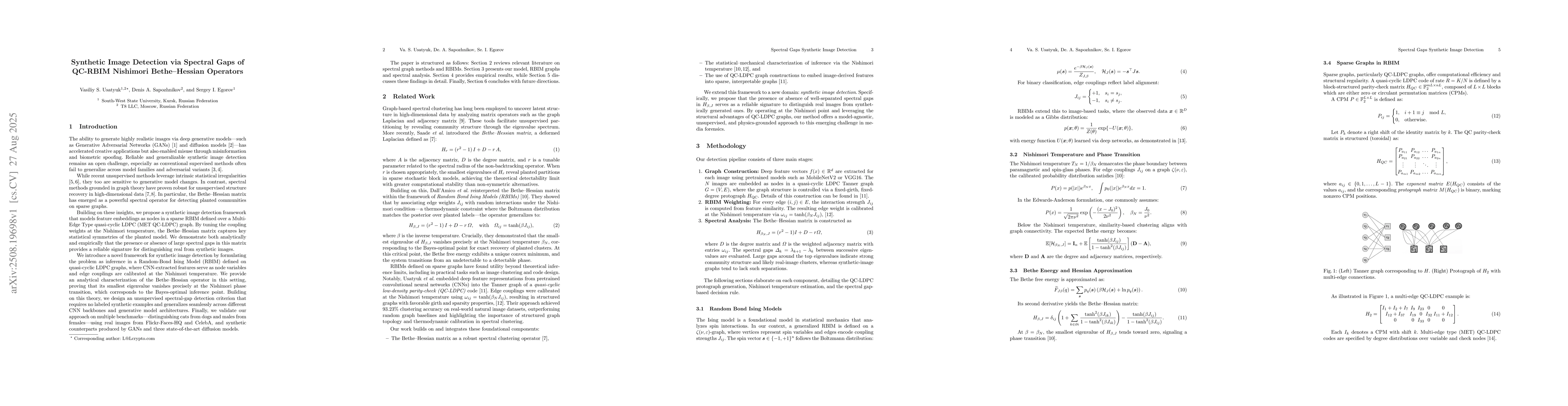 The rapid advance of deep generative models such as GANs and diffusion networks now produces images that are virtually indistinguishable from genuine photographs, undermining media forensics and biometric security. Supervised detectors quickly lose effectiveness on unseen generators or after adversarial post-processing, while existing unsupervised methods that rely on low-level statistical cues remain fragile. We introduce a physics-inspired, model-agnostic detector that treats synthetic-image identification as a community-detection problem on a sparse weighted graph. Image features are first extracted with pretrained CNNs and reduced to 32 dimensions, each feature vector becomes a node of a Multi-Edge Type QC-LDPC graph. Pairwise similarities are transformed into edge couplings calibrated at the Nishimori temperature, producing a Random Bond Ising Model (RBIM) whose Bethe-Hessian spectrum exhibits a characteristic gap when genuine community structure (real images) is present. Synthetic images violate the Nishimori symmetry and therefore lack such gaps. We validate the approach on binary tasks cat versus dog and male versus female using real photos from Flickr-Faces-HQ and CelebA and synthetic counterparts generated by GANs and diffusion models. Without any labeled synthetic data or retraining of the feature extractor, the detector achieves over 94% accuracy. Spectral analysis shows multiple well separated gaps for real image sets and a collapsed spectrum for generated ones. Our contributions are threefold: a novel LDPC graph construction that embeds deep image features, an analytical link between Nishimori temperature RBIM and the Bethe-Hessian spectrum providing a Bayes optimal detection criterion; and a practical, unsupervised synthetic image detector robust to new generative architectures. Future work will extend the framework to video streams and multi-class anomaly detection.