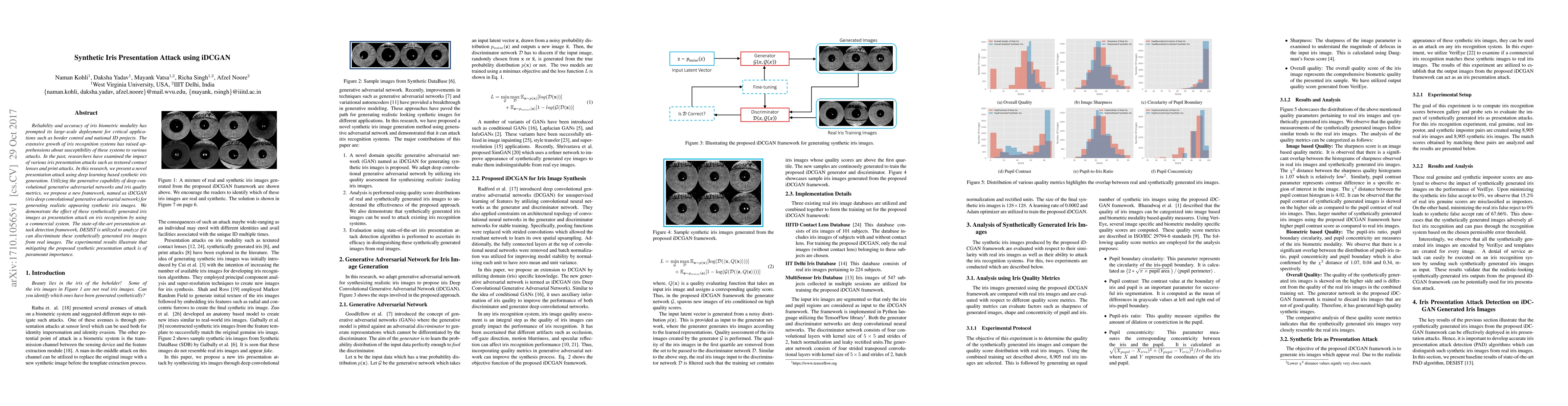 This paper introduces a novel synthetic iris presentation attack using iDCGAN, a deep convolutional generative adversarial network, to create realistic synthetic iris images. The study demonstrates the effectiveness of these synthetic images in bypassing commercial iris recognition systems and highlights the need for advanced detection methods.