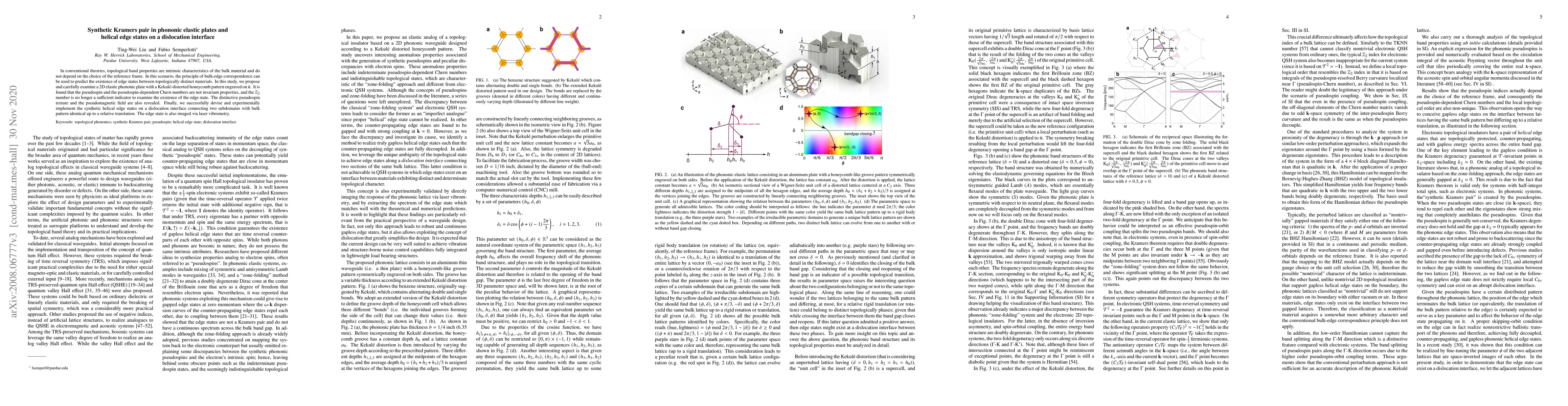 This study investigates a 2D phononic elastic plate with a Kekulé-distorted honeycomb pattern, revealing that topological properties like pseudospin and Chern numbers are not invariant. It successfully demonstrates synthetic helical edge states on a dislocation interface, challenging conventional bulk-edge correspondence principles.