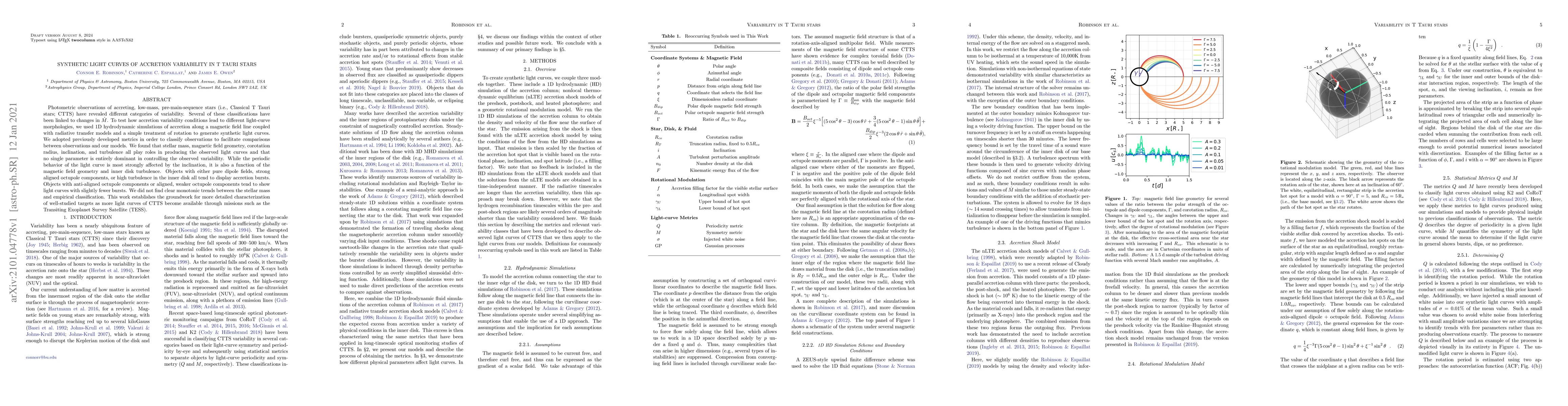Researchers created synthetic light curves of accretion variability in T Tauri stars to better understand how changes in accretion rate affect the star's brightness, finding that multiple factors influence the observed light curve morphologies.