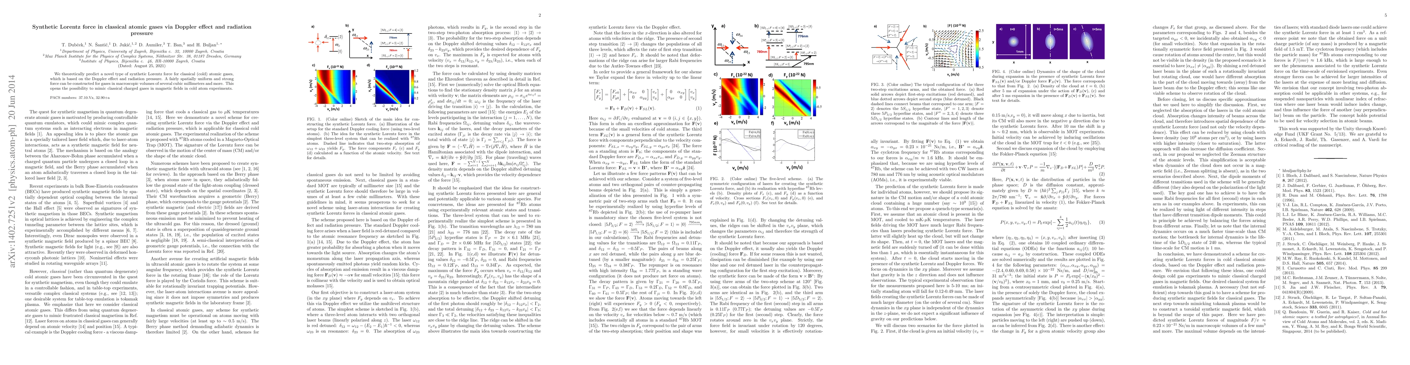 This paper proposes a synthetic Lorentz force in cold atomic gases using the Doppler effect and radiation pressure, enabling the simulation of classical charged gas behavior in magnetic fields, akin to tokamak conditions, within macroscopic volumes. This method offers a new approach for cold atom experiments.