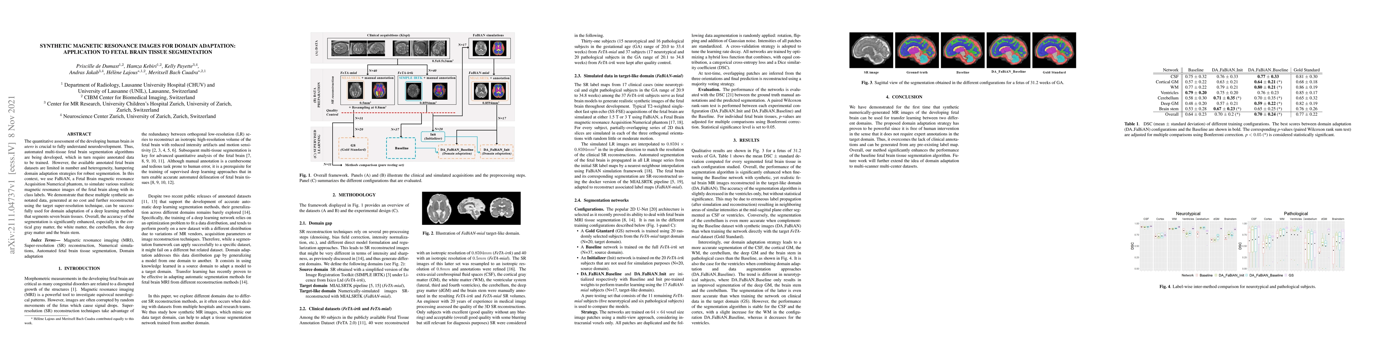 This paper proposes using synthetic magnetic resonance images generated by FaBiAN to enhance domain adaptation for fetal brain tissue segmentation. The synthetic data, combined with super-resolution techniques, significantly improve the accuracy of deep learning segmentation algorithms, particularly for cortical gray matter, white matter, cerebellum, deep gray matter, and brain stem.