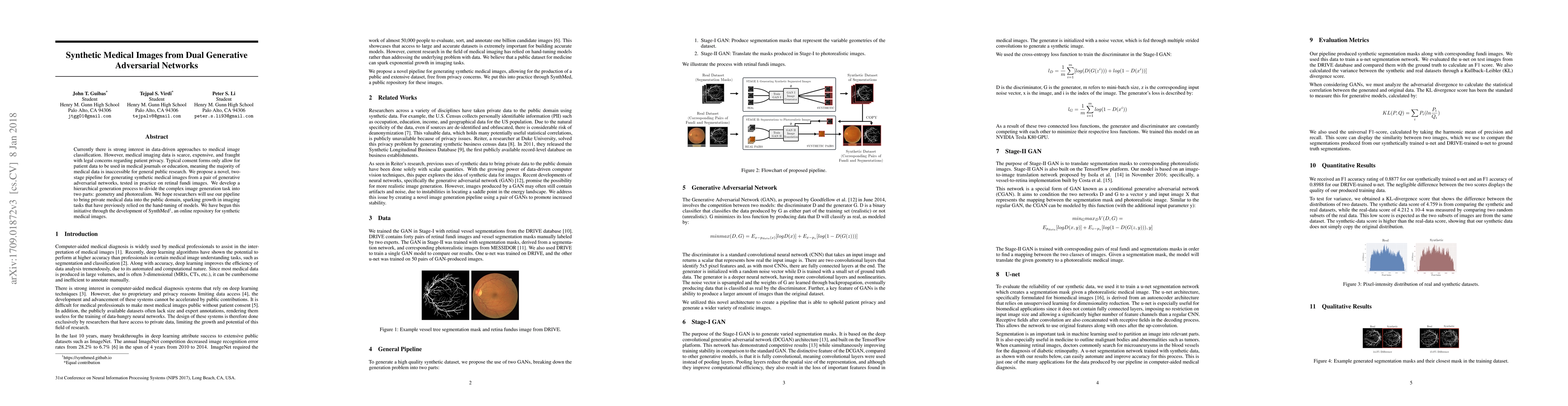 This paper proposes a dual generative adversarial network (GAN) pipeline to generate synthetic medical images, addressing the scarcity and privacy issues of real medical data. The method divides image generation into geometry and photorealism stages, demonstrated on retinal fundus images, aiming to make private medical data accessible for research.