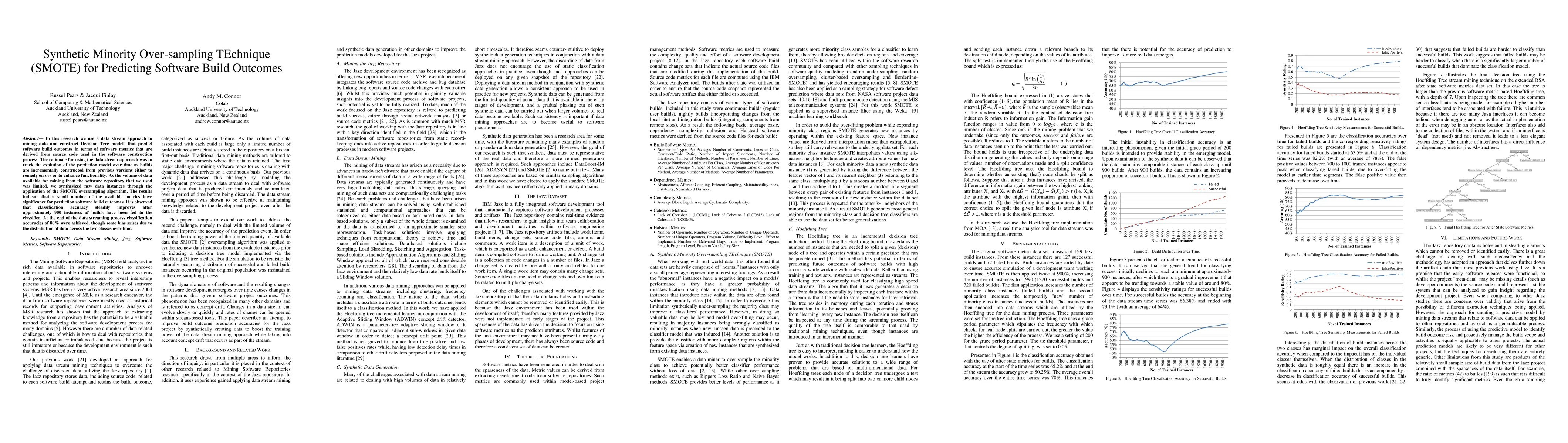 The application of SMOTE for synthetic data generation in conjunction with Hoeffding tree incremental learner for classifying high-speed data streams in predicting software build outcomes.