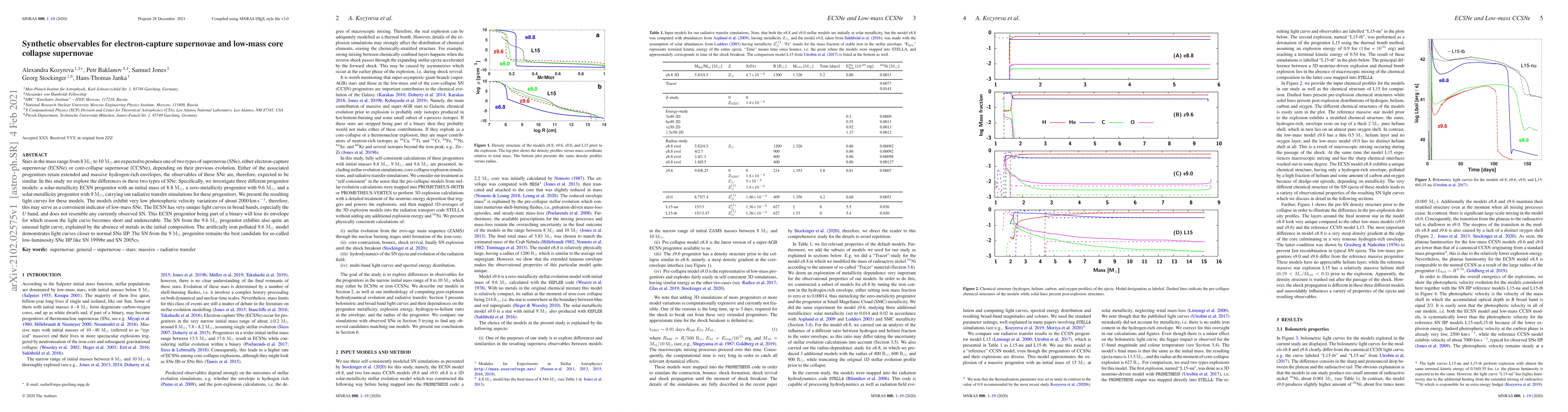 Stars in the mass range from 8 to 10 solar masses are expected to produce one of two types of supernovae (SNe), either electron-capture supernovae (ECSNe) or core-collapse supernovae (CCSNe), depending on their previous evolution. Either of the associated progenitors retain extended and massive hydrogen-rich envelopes, the observables of these SNe are, therefore, expected to be similar. In this study we explore the differences in these two types of SNe. Specifically, we investigate three different progenitor models: a solar-metallicity ECSN progenitor with an initial mass of 8.8 solar masses, a zero-metallicity progenitor with 9.6 solar masses, and a solar-metallicity progenitor with 9 solar masses, carrying out radiative transfer simulations for these progenitors. We present the resulting light curves for these models. The models exhibit very low photospheric velocity variations of about 2000 km/s, therefore, this may serve as a convenient indicator of low-mass SNe. The ECSN has very unique light curves in broad bands, especially the U band, and does not resemble any currently observed SN. This ECSN progenitor being part of a binary will lose its envelope for which reason the light curve becomes short and undetectable. The SN from the 9.6 solar masses progenitor exhibits also quite an unusual light curve, explained by the absence of metals in the initial composition. The artificially iron polluted 9.6 solar masses model demonstrates light curves closer to normal SNe IIP. The SN from the 9 solar masses progenitor remains the best candidate for so-called low-luminosity SNe IIP like SN 1999br and SN 2005cs.