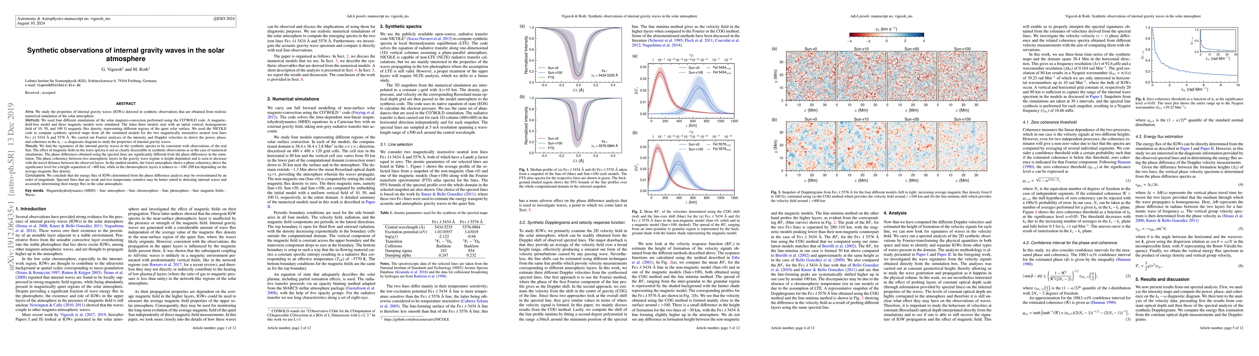 This paper investigates internal gravity waves (IGWs) in synthetic observations derived from numerical simulations of the solar atmosphere. The study finds that IGW signatures in synthetic spectra match real solar observations, but the phase differences differ significantly from simulations, suggesting an overestimation of IGW energy flux by an order of magnitude. It concludes that less temperature-sensitive spectral lines may better detect these waves.