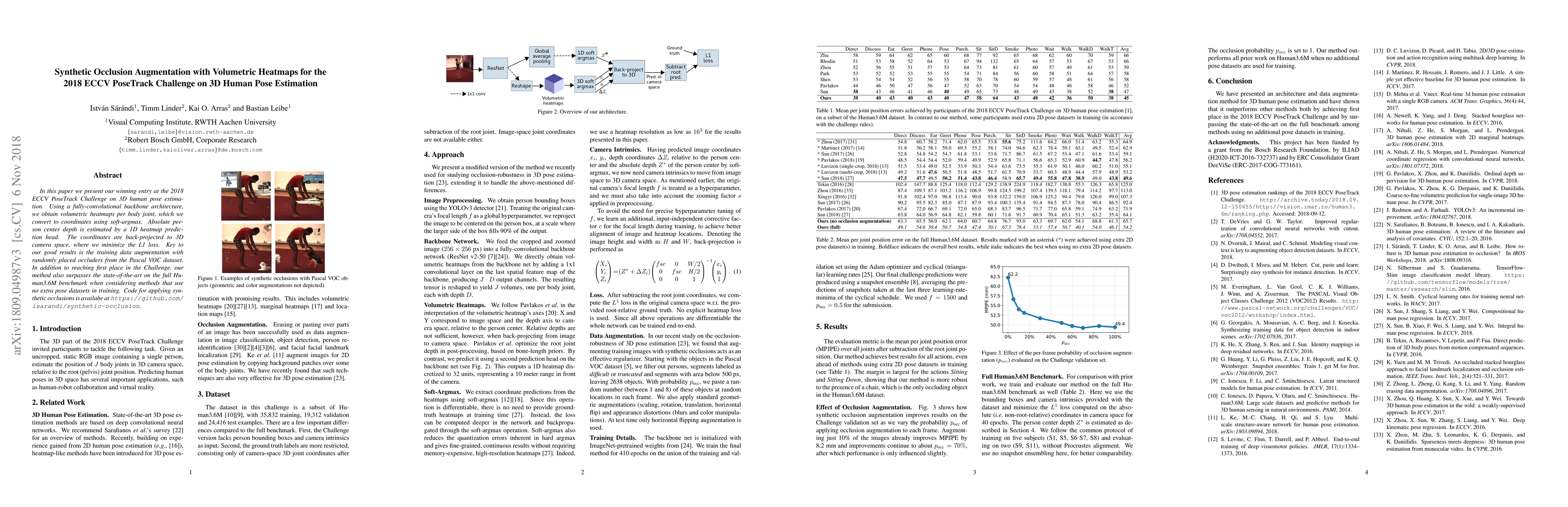 This paper presents a winning method for the 2018 ECCV PoseTrack Challenge using synthetic occlusion augmentation with volumetric heatmaps for 3D human pose estimation, achieving state-of-the-art results without additional training datasets. The approach employs a fully-convolutional network and synthetic occluders to enhance training data.