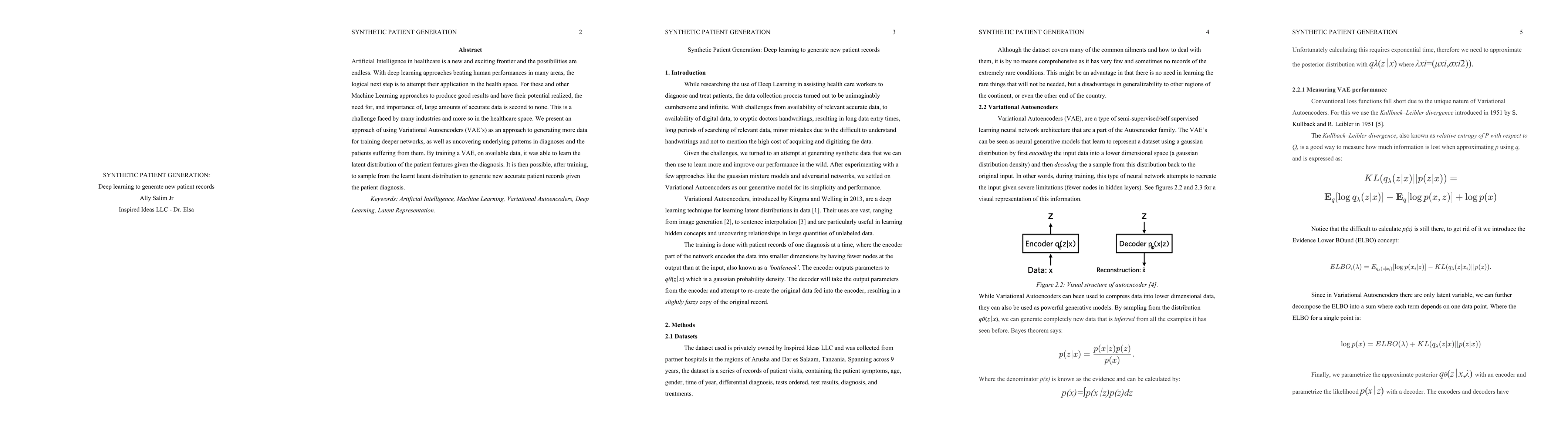 Artificial Intelligence in healthcare is a new and exciting frontier and the possibilities are endless. With deep learning approaches beating human performances in many areas, the logical next step is to attempt their application in the health space. For these and other Machine Learning approaches to produce good results and have their potential realized, the need for, and importance of, large amounts of accurate data is second to none. This is a challenge faced by many industries and more so in the healthcare space. We present an approach of using Variational Autoencoders (VAE's) as an approach to generating more data for training deeper networks, as well as uncovering underlying patterns in diagnoses and the patients suffering from them. By training a VAE, on available data, it was able to learn the latent distribution of the patient features given the diagnosis. It is then possible, after training, to sample from the learnt latent distribution to generate new accurate patient records given the patient diagnosis.