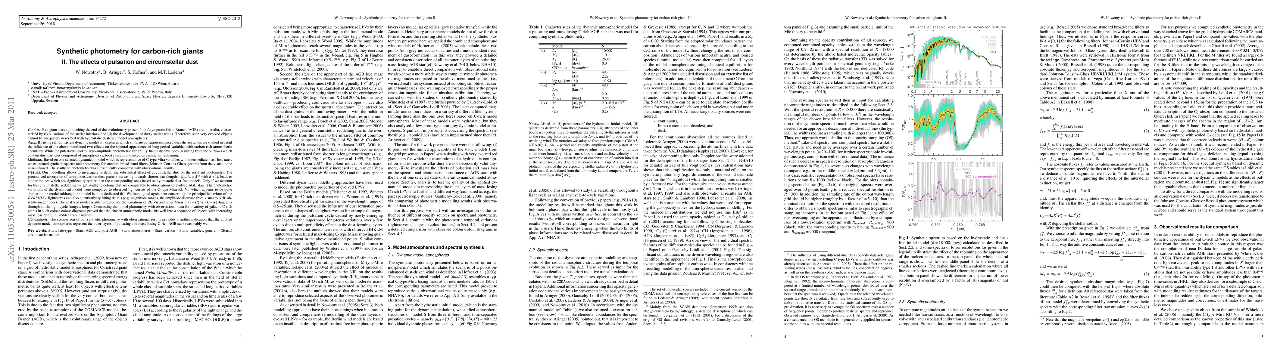 By using self-consistent dynamic model atmospheres which simulate pulsation-enhanced dust-driven winds of AGB stars we studied in detail the influence of (i) pulsations of the stellar interiors, and (ii) the development of dusty stellar winds on the spectral appearance of long period variables with carbon-rich atmospheric chemistry. While the pulsations lead to large-amplitude photometric variability, the dusty envelopes cause pronounced circumstellar reddening. Based on one selected dynamical model which is representative of C-type Mira variables with intermediate mass loss rates, we calculated synthetic spectra and photometry for standard broad-band filters from the visual to the near-infrared. Our modelling allows to investigate in detail the substantial effect of circumstellar dust on the resultant photometry. The pronounced absorption of amorphous carbon dust grains leads to colour indices which are significantly redder than the corresponding ones based on hydrostatic dust-free models. Only if we account for this circumstellar reddening we get synthetic colours that are comparable to observations of evolved AGB stars. The photometric variations of the dynamical model were compared to observed lightcurves of the C-type Mira RU_Vir which appears to be quite similar to the model. We found good agreement concerning the principal behaviour of the BVRIJHKL lightcurves and also quantitatively fitting details. The analysed model is able to reproduce the variations of RU_Vir and other Miras in (J-H) vs. (H-K) diagrams throughout the light cycle. Contrasting the model photometry with observational data for a variety of galactic C-rich giants in such colour-colour diagrams proved that the chosen atmospheric model fits well into a sequence of objects with increasing mass loss rates, i.e., redder colour indices.