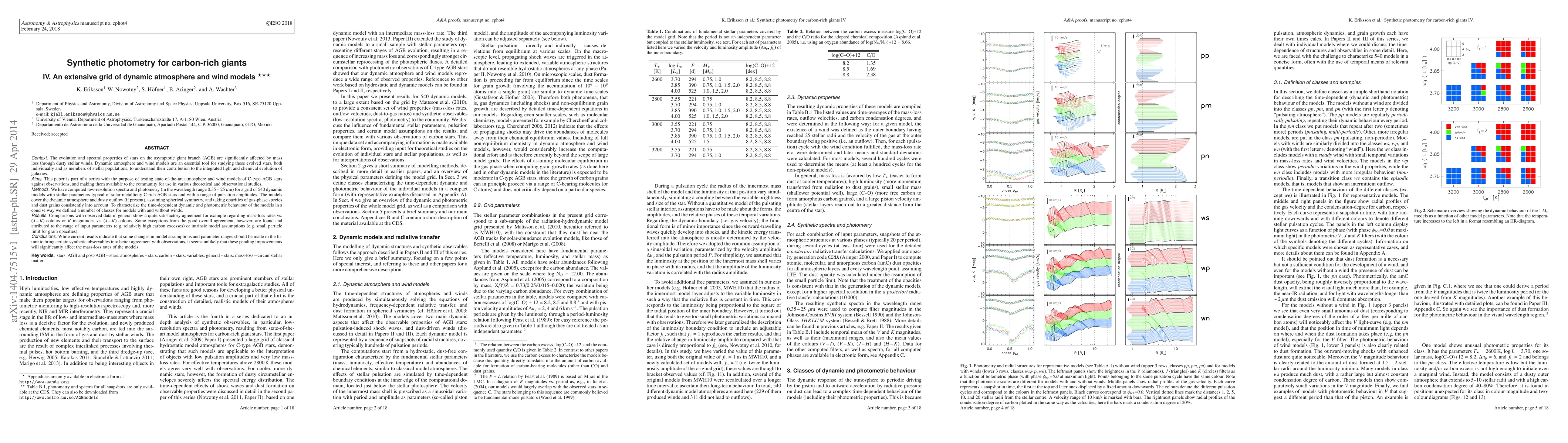The evolution and spectral properties of stars on the AGB are significantly affected by mass loss through dusty stellar winds. Dynamic atmosphere and wind models are an essential tool for studying these evolved stars, both individually and as members of stellar populations, to understand their contribution to the integrated light and chemical evolution of galaxies. This paper is part of a series testing state-of-the-art atmosphere and wind models of carbon stars against observations, and making them available for use in various theoretical and observational studies. We have computed low-resolution spectra and photometry (in the wavelength range 0.35-25 mu) for a grid of 540 dynamic models with stellar parameters typical of solar-metallicity C-rich AGB stars and with a range of pulsation amplitudes. The models cover the dynamic atmosphere and dusty outflow (if present), assuming spherical symmetry, and taking opacities of gas-phase species and dust grains consistently into account. To characterize the time-dependent dynamic and photometric behaviour of the models in a concise way we defined a number of classes for models with and without winds. Comparisons with observed data in general show a quite good agreement for example regarding mass-loss rates vs. (J-K) colours or K magnitudes vs. (J-K) colours. Some exceptions from the good overall agreement, however, are found and attributed to the range of input parameters (e.g. relatively high carbon excesses) or intrinsic model assumptions (e.g. small particle limit for grain opacities). While current results indicate that some changes in model assumptions and parameter ranges should be made in the future to bring certain synthetic observables into better agreement with observations, it seems unlikely that these pending improvements will significantly affect the mass-loss rates of the models.