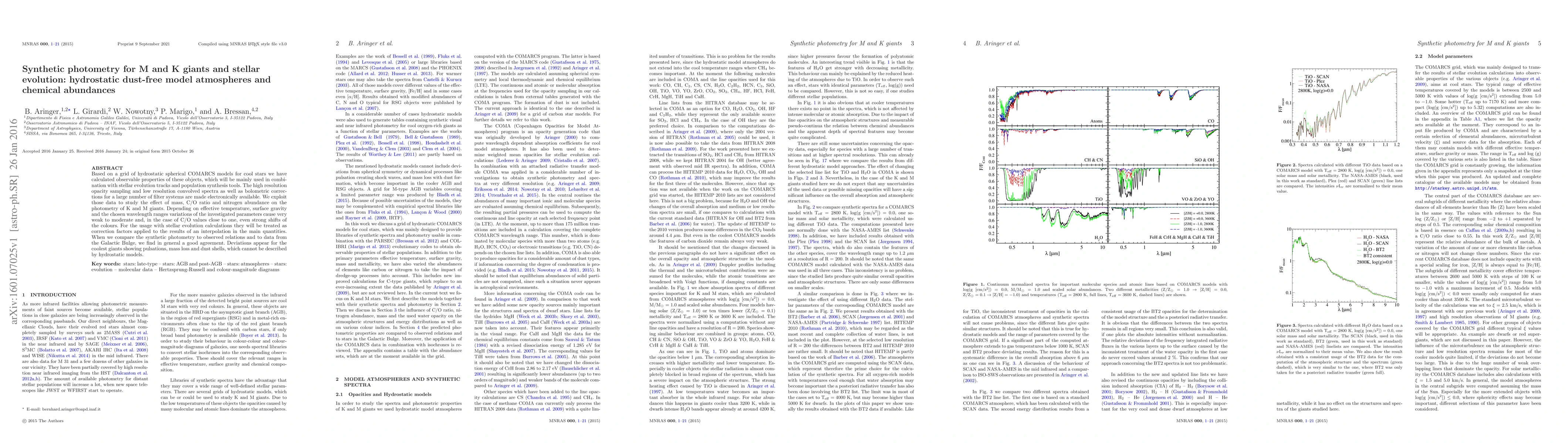 Based on a grid of hydrostatic spherical COMARCS models for cool stars we have calculated observable properties of these objects, which will be mainly used in combination with stellar evolution tracks and population synthesis tools. The high resolution opacity sampling and low resolution convolved spectra as well as bolometric corrections for a large number of filter systems are made electronically available. We exploit those data to study the effect of mass, C/O ratio and nitrogen abundance on the photometry of K and M giants. Depending on effective temperature, surface gravity and the chosen wavelength ranges variations of the investigated parameters cause very weak to moderate and, in the case of C/O values close to one, even strong shifts of the colours. For the usage with stellar evolution calculations they will be treated as correction factors applied to the results of an interpolation in the main quantities. When we compare the synthetic photometry to observed relations and to data from the Galactic Bulge, we find in general a good agreement. Deviations appear for the coolest giants showing pulsations, mass loss and dust shells, which cannot be described by hydrostatic models.