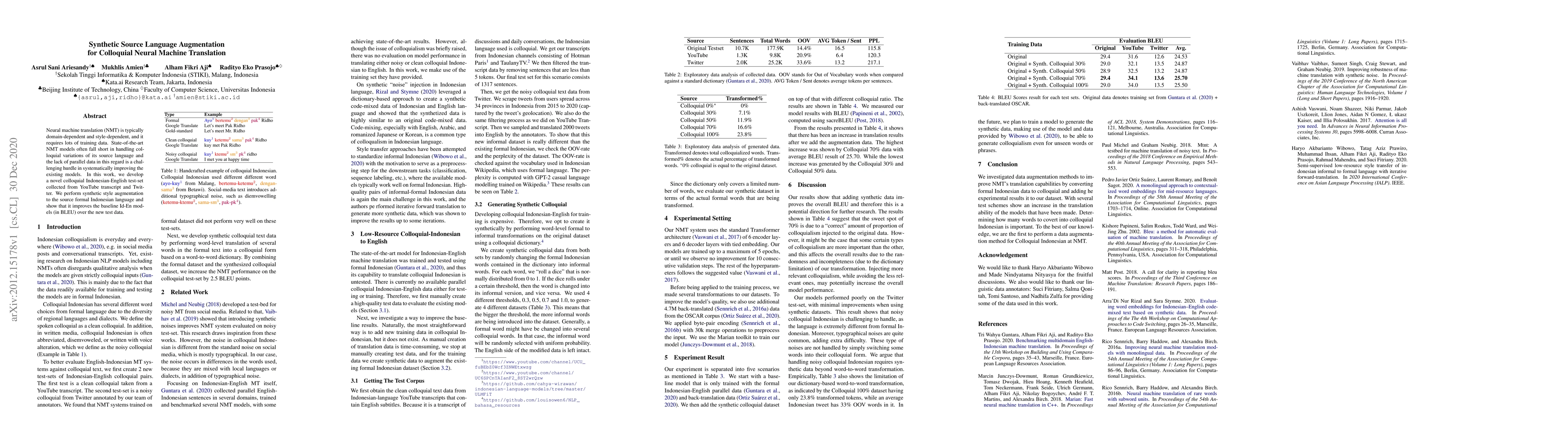 Neural machine translation (NMT) is typically domain-dependent and style-dependent, and it requires lots of training data. State-of-the-art NMT models often fall short in handling colloquial variations of its source language and the lack of parallel data in this regard is a challenging hurdle in systematically improving the existing models. In this work, we develop a novel colloquial Indonesian-English test-set collected from YouTube transcript and Twitter. We perform synthetic style augmentation to the source of formal Indonesian language and show that it improves the baseline Id-En models (in BLEU) over the new test data.