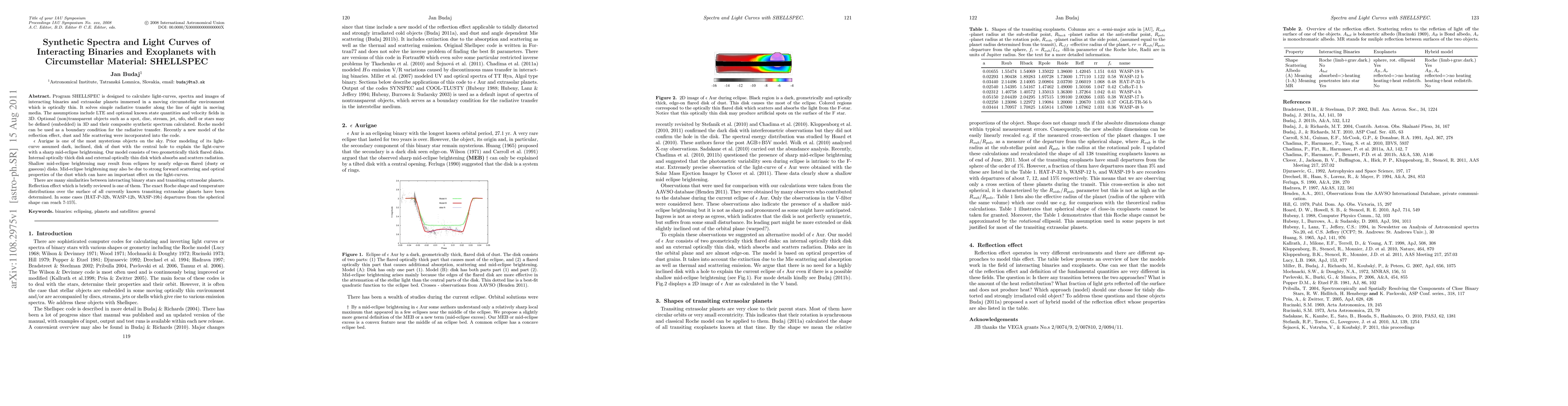 Program SHELLSPEC is designed to calculate light-curves, spectra and images of interacting binaries and extrasolar planets immersed in a moving circumstellar environment which is optically thin. It solves simple radiative transfer along the line of sight in moving media. The assumptions include LTE and optional known state quantities and velocity fields in 3D. Optional (non)transparent objects such as a spot, disc, stream, jet, ufo, shell or stars may be defined (embedded) in 3D and their composite synthetic spectrum calculated. Roche model can be used as a boundary condition for the radiative transfer. Recently a new model of the reflection effect, dust and Mie scattering were incorporated into the code. $\epsilon$ Aurigae is one of the most mysterious objects on the sky. Prior modeling of its light-curve assumed dark, inclined, disk of dust with the central hole to explain the light-curve with a sharp mid-eclipse brightening. Our model consists of two geometrically thick flared disks. Internal optically thick disk and external optically thin disk which absorbs and scatters radiation. Shallow mid-eclipse brightening may result from eclipses by nearly edge-on flared (dusty or gaseous) disks. Mid-eclipse brightening may also be due to strong forward scattering and optical properties of the dust which can have an important effect on the light-curves. There are many similarities between interacting binary stars and transiting extrasolar planets. Reflection effect which is briefly reviewed is one of them. The exact Roche shape and temperature distributions over the surface of all currently known transiting extrasolar planets have been determined. In some cases (HAT-P-32b, WASP-12b, WASP-19b) departures from the spherical shape can reach 7-15%.