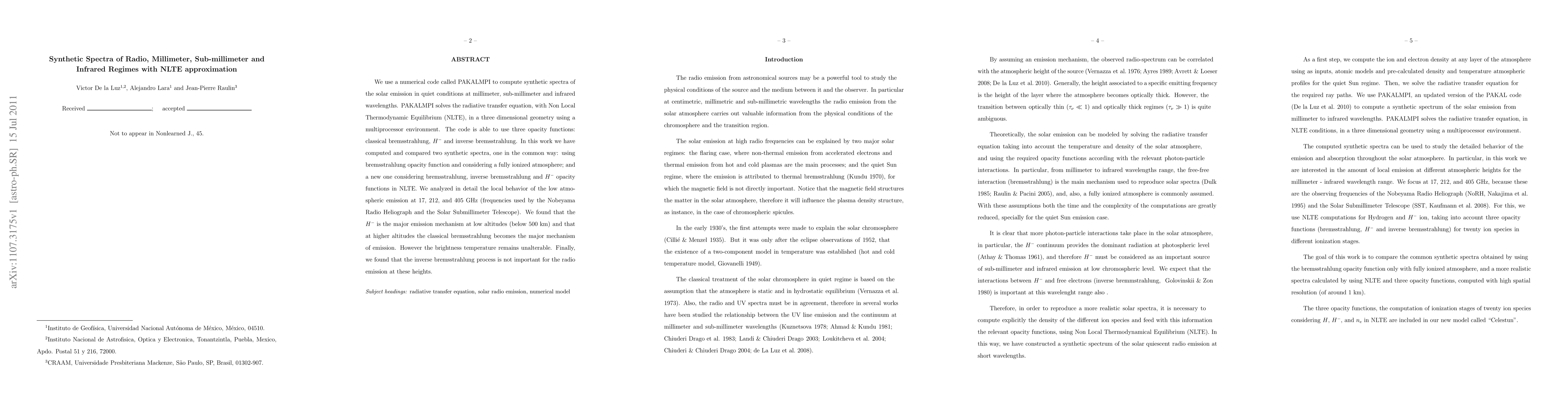 We use a numerical code called PAKALMPI to compute synthetic spectra of the solar emission in quiet conditions at millimeter, sub-millimeter and infrared wavelengths. PAKALMPI solves the radiative transfer equation, with Non Local Thermodynamic Equilibrium (NLTE), in a three dimensional geometry using a multiprocessor environment. The code is able to use three opacity functions: classical bremsstrahlung, H-and inverse bremsstrahlung. In this work we have computed and compared two synthetic spectra, one in the common way: using bremsstrahlung opacity function and considering a fully ionized atmosphere; and a new one considering bremsstrahlung, inverse bremsstrahlung and H- opacity functions in NLTE. We analyzed in detail the local behavior of the low atmospheric emission at 17, 212, and 405 GHz (frequencies used by the Nobeyama Radio Heliograph and the Solar Submillimeter Telescope). We found that the H- is the major emission mechanism at low altitudes (below 500 km) and that at higher altitudes the classical bremsstrahlung becomes the major mechanism of emission. However the brightness temperature remains unalterable. Finally, we found that the inverse bremsstrahlung process is not important for the radio emission at these heights.