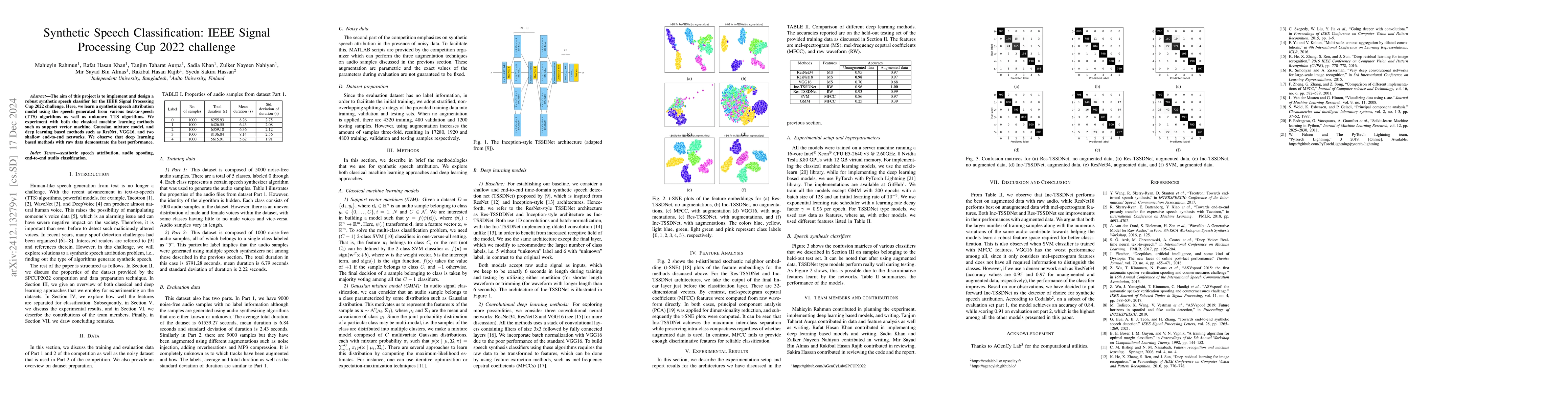 This research develops a robust synthetic speech classifier for the IEEE Signal Processing Cup 2022, employing classical machine learning and deep learning methods to distinguish synthetic speech from various text-to-speech algorithms. Deep learning approaches using raw data show the best classification performance.
