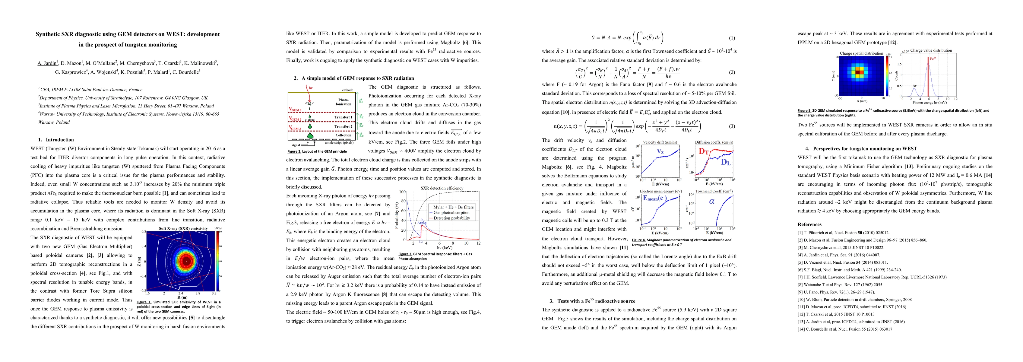 This paper develops a synthetic Soft X-ray (SXR) diagnostic using GEM detectors on WEST for tungsten monitoring, aiming to improve plasma performance by studying tungsten transport. The diagnostic employs GEM-based poloidal cameras for 2D tomographic reconstructions, enabling detailed spectral analysis of SXR emissions in fusion environments.