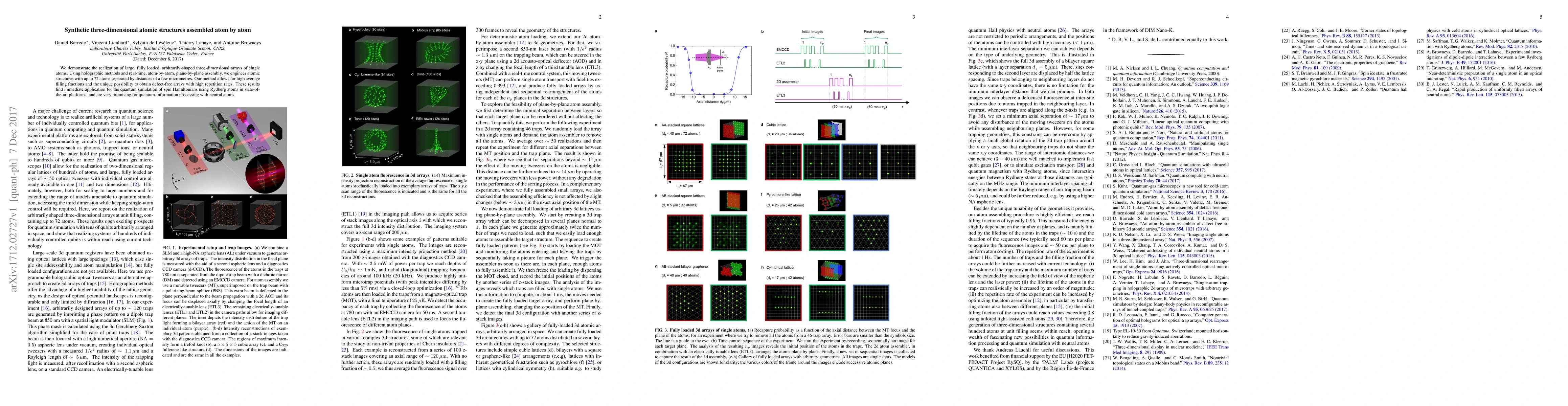 This paper presents a method for assembling large, defect-free, three-dimensional arrays of single atoms using holographic techniques and real-time, atom-by-atom assembly, enabling high filling fractions and repetition rates. This advancement is crucial for quantum simulation and quantum-information processing with Rydberg atoms.