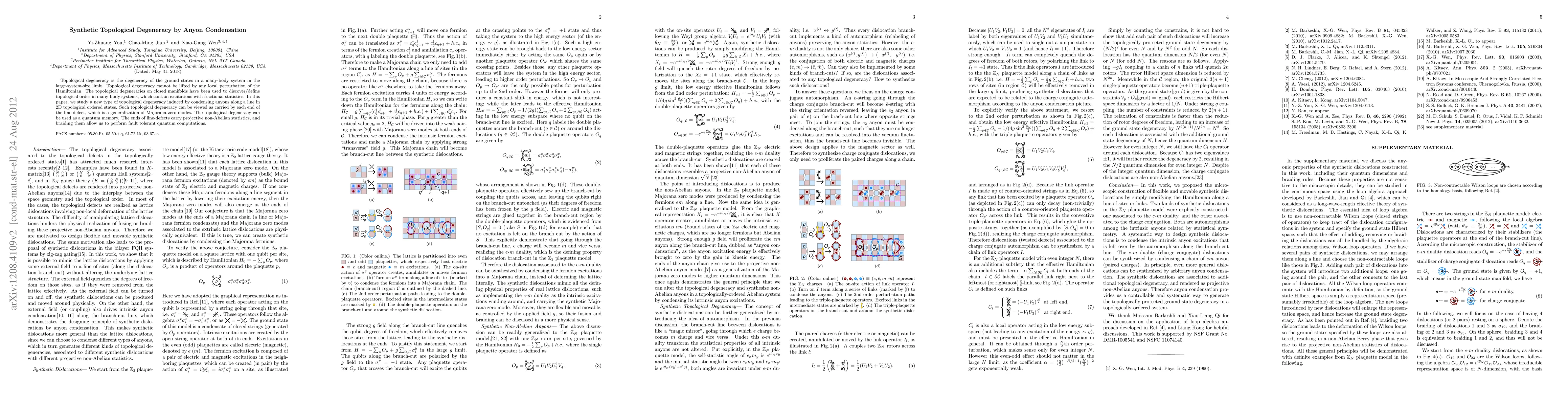 Topological degeneracy is the degeneracy of the ground states in a many-body system in the large-system-size limit. Topological degeneracy cannot be lifted by any local perturbation of the Hamiltonian. The topological degeneracies on closed manifolds have been used to discover/define topological order in many-body systems, which contain excitations with fractional statistics. In this paper, we study a new type of topological degeneracy induced by condensing anyons along a line in 2D topological ordered states. Such topological degeneracy can be viewed as carried by each end of the line-defect, which is a generalization of Majorana zero-modes. The topological degeneracy can be used as a quantum memory. The ends of line-defects carry projective non-Abelian statistics, and braiding them allow us to perform fault tolerant quantum computations.
