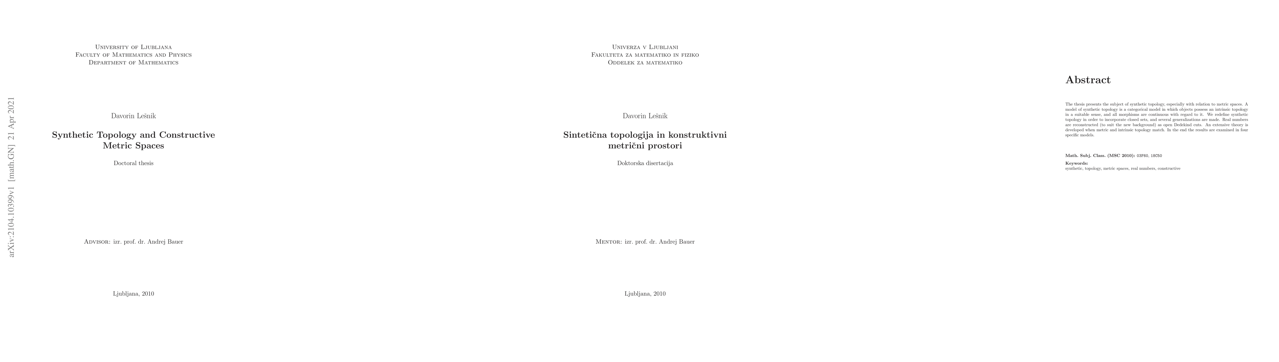 The thesis presents the subject of synthetic topology, especially with relation to metric spaces. A model of synthetic topology is a categorical model in which objects possess an intrinsic topology in a suitable sense, and all morphisms are continuous with regard to it. We redefine synthetic topology in order to incorporate closed sets, and several generalizations are made. Real numbers are reconstructed (to suit the new background) as open Dedekind cuts. An extensive theory is developed when metric and intrinsic topology match. In the end the results are examined in four specific models.