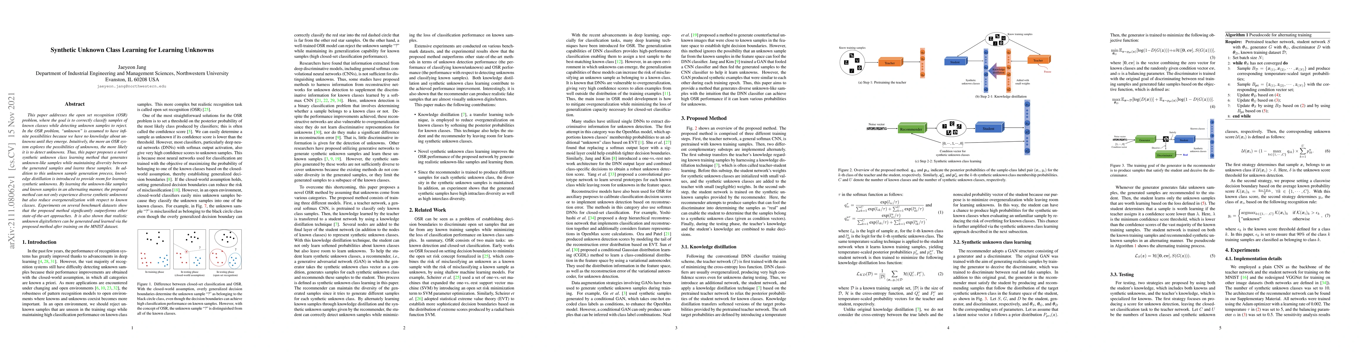 This paper proposes a synthetic unknown class learning method for open set recognition, generating diverse synthetic unknown samples to enhance detection of actual unknowns while reducing overgeneralization to known classes. The method combines synthetic sample generation and knowledge distillation, achieving superior performance on benchmark datasets.