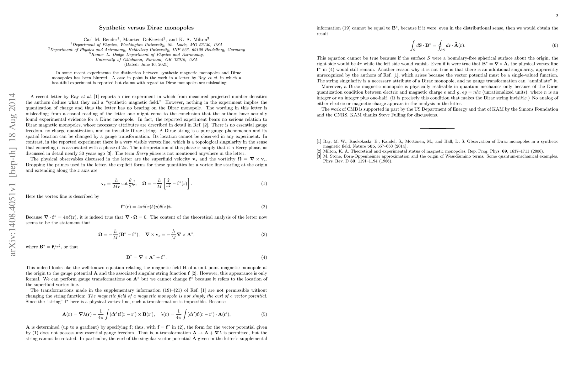 In some recent experiments the distinction between synthetic magnetic monopoles and Dirac monopoles has been blurred. A case in point is the work in a letter by Ray {\it et al.} [arXiv:1408.3133] in which a beautiful experiment is reported but claims with regard to Dirac monopoles are misleading.