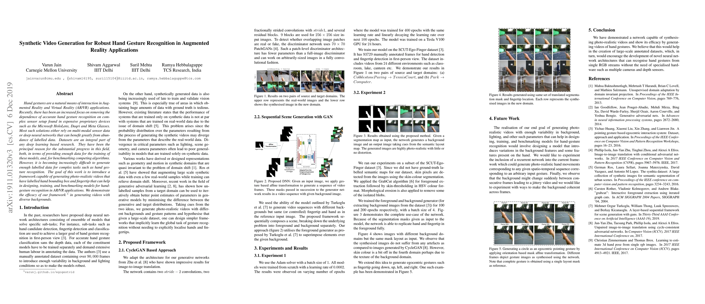 This paper introduces a framework for synthetic video generation to create photo-realistic videos with labelled hand gestures, aiding in training and benchmarking models for robust hand gesture recognition in AR/VR applications. The framework addresses the challenge of limited labelled data for complex tasks by generating diverse, realistic videos.
