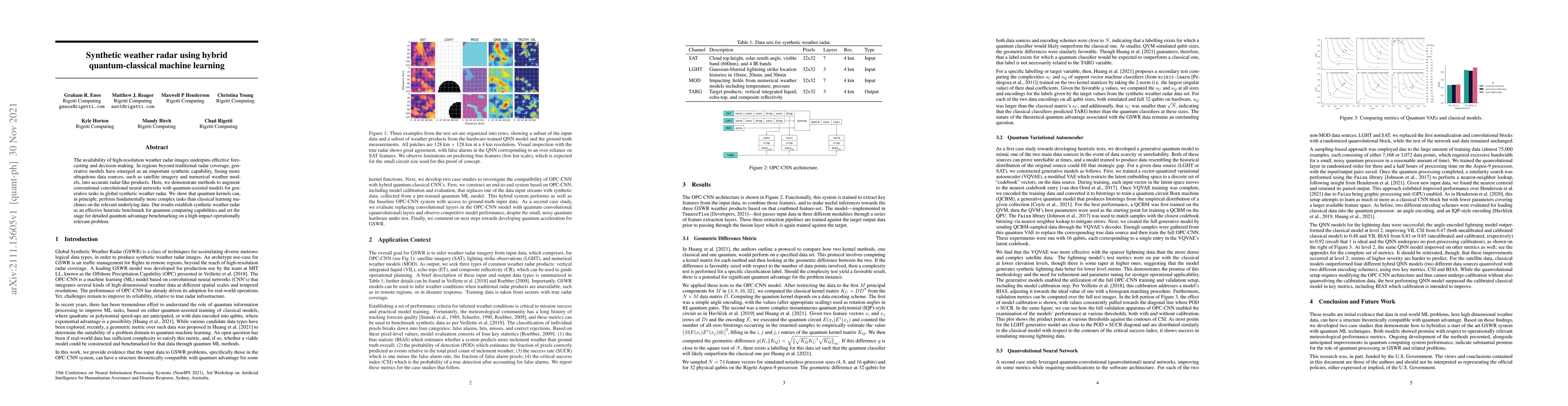 The availability of high-resolution weather radar images underpins effective forecasting and decision-making. In regions beyond traditional radar coverage, generative models have emerged as an important synthetic capability, fusing more ubiquitous data sources, such as satellite imagery and numerical weather models, into accurate radar-like products. Here, we demonstrate methods to augment conventional convolutional neural networks with quantum-assisted models for generative tasks in global synthetic weather radar. We show that quantum kernels can, in principle, perform fundamentally more complex tasks than classical learning machines on the relevant underlying data. Our results establish synthetic weather radar as an effective heuristic benchmark for quantum computing capabilities and set the stage for detailed quantum advantage benchmarking on a high-impact operationally relevant problem.