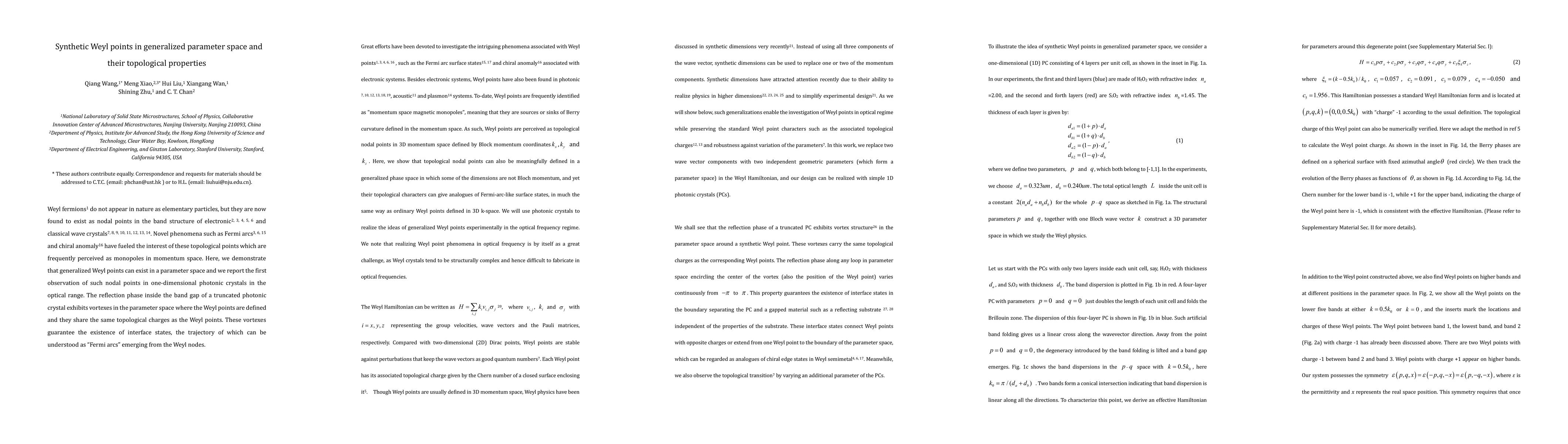 Weyl fermions1 do not appear in nature as elementary particles, but they are now found to exist as nodal points in the band structure of electronic and classical wave crystals. Novel phenomena such as Fermi arcs and chiral anomaly have fueled the interest of these topological points which are frequently perceived as monopoles in momentum space. Here, we demonstrate that generalized Weyl points can exist in a parameter space and we report the first observation of such nodal points in one-dimensional photonic crystals in the optical range. The reflection phase inside the band gap of a truncated photonic crystal exhibits vortexes in the parameter space where the Weyl points are defined and they share the same topological charges as the Weyl points. These vortexes guarantee the existence of interface states, the trajectory of which can be understood as "Fermi arcs" emerging from the Weyl nodes.