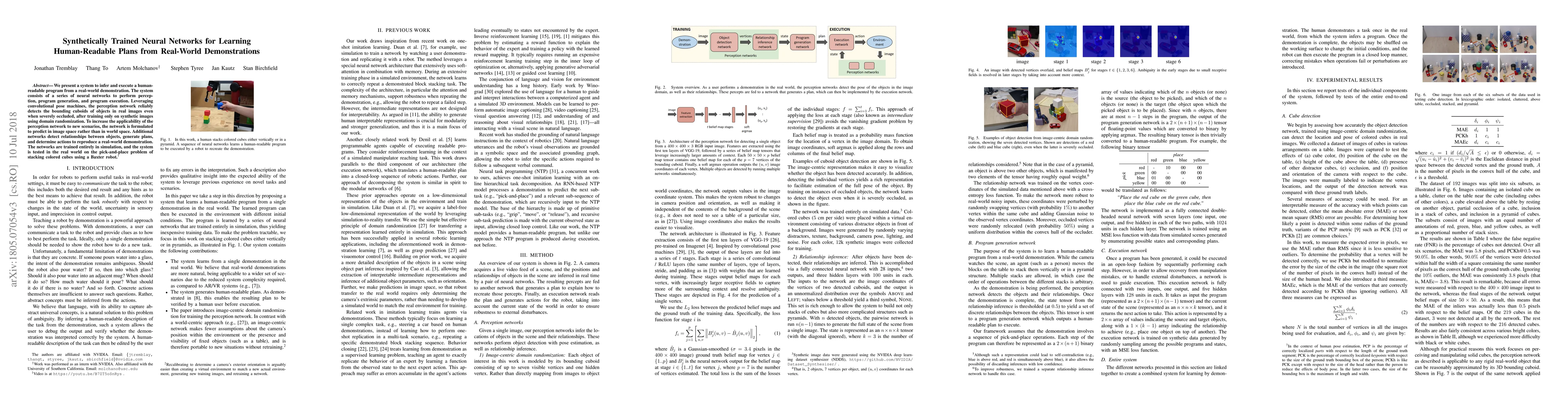 This research introduces a system using synthetic-trained neural networks to infer and execute human-readable programs from real-world demonstrations. The system, tested on a Baxter robot, includes networks for perception, program generation, and execution, with a key innovation of a perception network predicting in image space for broader applicability. All components are trained in simulation.