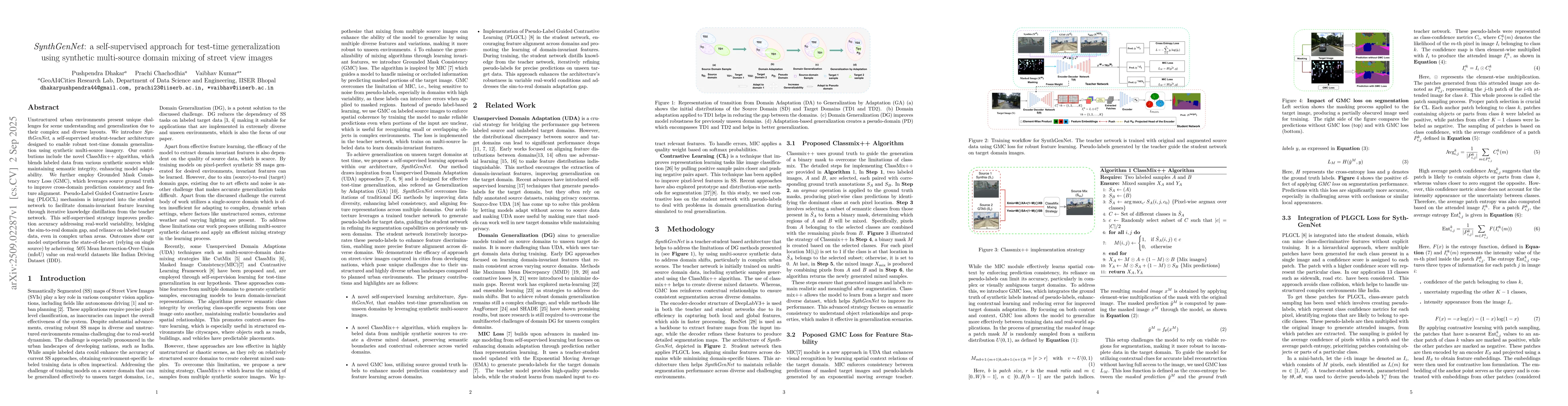 Unstructured urban environments present unique challenges for scene understanding and generalization due to their complex and diverse layouts. We introduce SynthGenNet, a self-supervised student-teacher architecture designed to enable robust test-time domain generalization using synthetic multi-source imagery. Our contributions include the novel ClassMix++ algorithm, which blends labeled data from various synthetic sources while maintaining semantic integrity, enhancing model adaptability. We further employ Grounded Mask Consistency Loss (GMC), which leverages source ground truth to improve cross-domain prediction consistency and feature alignment. The Pseudo-Label Guided Contrastive Learning (PLGCL) mechanism is integrated into the student network to facilitate domain-invariant feature learning through iterative knowledge distillation from the teacher network. This self-supervised strategy improves prediction accuracy, addresses real-world variability, bridges the sim-to-real domain gap, and reliance on labeled target data, even in complex urban areas. Outcomes show our model outperforms the state-of-the-art (relying on single source) by achieving 50% Mean Intersection-Over-Union (mIoU) value on real-world datasets like Indian Driving Dataset (IDD).