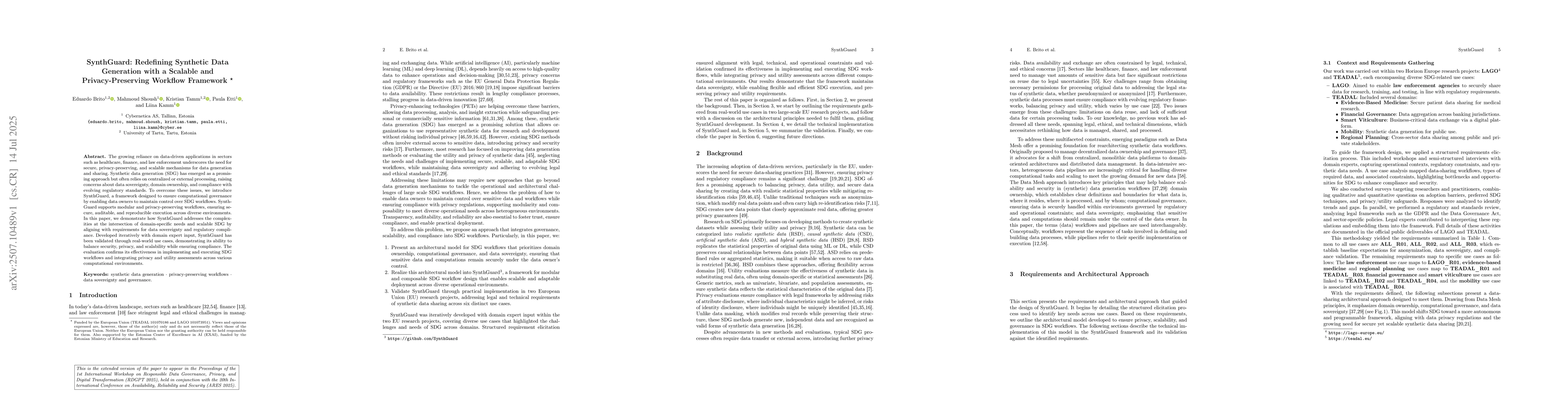 The growing reliance on data-driven applications in sectors such as healthcare, finance, and law enforcement underscores the need for secure, privacy-preserving, and scalable mechanisms for data generation and sharing. Synthetic data generation (SDG) has emerged as a promising approach but often relies on centralized or external processing, raising concerns about data sovereignty, domain ownership, and compliance with evolving regulatory standards. To overcome these issues, we introduce SynthGuard, a framework designed to ensure computational governance by enabling data owners to maintain control over SDG workflows. SynthGuard supports modular and privacy-preserving workflows, ensuring secure, auditable, and reproducible execution across diverse environments. In this paper, we demonstrate how SynthGuard addresses the complexities at the intersection of domain-specific needs and scalable SDG by aligning with requirements for data sovereignty and regulatory compliance. Developed iteratively with domain expert input, SynthGuard has been validated through real-world use cases, demonstrating its ability to balance security, privacy, and scalability while ensuring compliance. The evaluation confirms its effectiveness in implementing and executing SDG workflows and integrating privacy and utility assessments across various computational environments.