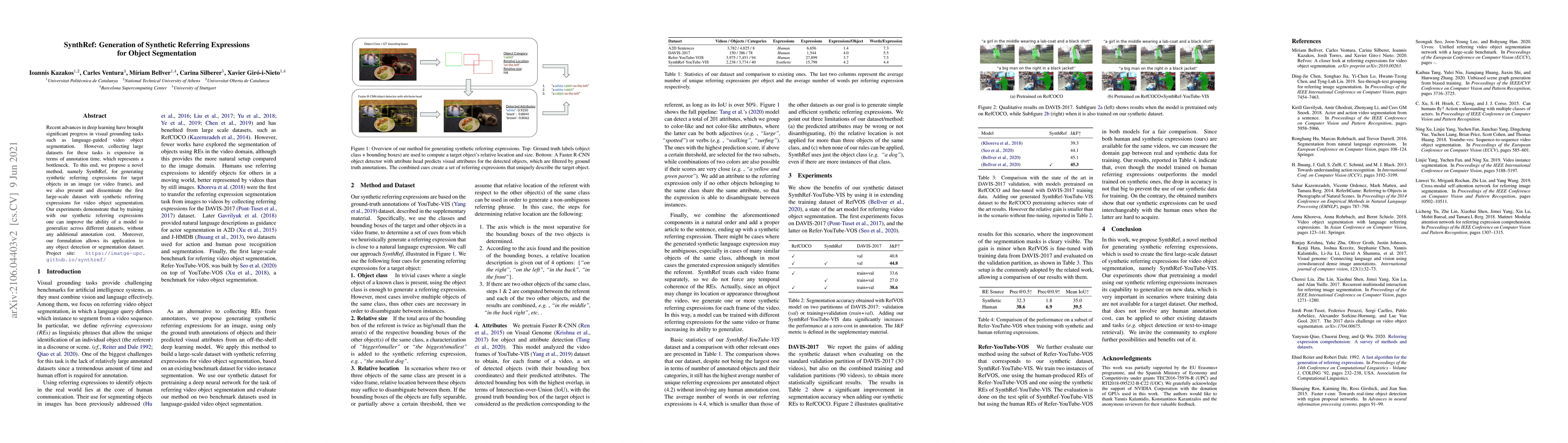 The paper introduces SynthRef, a method for generating synthetic referring expressions to aid in language-guided video object segmentation, addressing the high annotation cost of large datasets. The authors also release a large-scale dataset of synthetic referring expressions, showing that training with synthetic data improves model generalization without extra annotation costs.