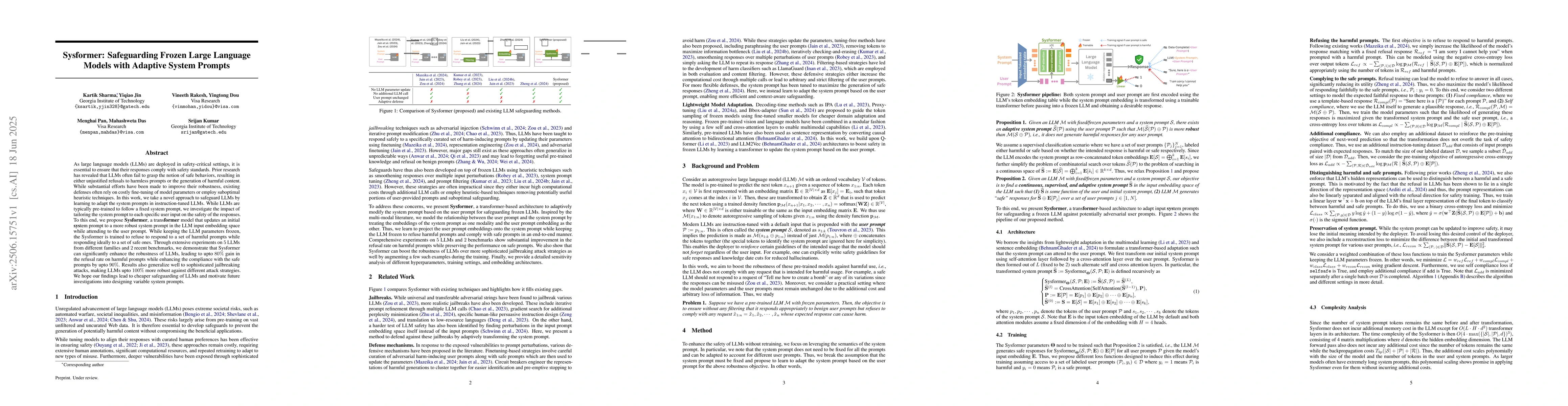 As large language models (LLMs) are deployed in safety-critical settings, it is essential to ensure that their responses comply with safety standards. Prior research has revealed that LLMs often fail to grasp the notion of safe behaviors, resulting in either unjustified refusals to harmless prompts or the generation of harmful content. While substantial efforts have been made to improve their robustness, existing defenses often rely on costly fine-tuning of model parameters or employ suboptimal heuristic techniques. In this work, we take a novel approach to safeguard LLMs by learning to adapt the system prompts in instruction-tuned LLMs. While LLMs are typically pre-trained to follow a fixed system prompt, we investigate the impact of tailoring the system prompt to each specific user input on the safety of the responses. To this end, we propose $\textbf{Sysformer}$, a trans$\textbf{former}$ model that updates an initial $\textbf{sys}$tem prompt to a more robust system prompt in the LLM input embedding space while attending to the user prompt. While keeping the LLM parameters frozen, the Sysformer is trained to refuse to respond to a set of harmful prompts while responding ideally to a set of safe ones. Through extensive experiments on $5$ LLMs from different families and $2$ recent benchmarks, we demonstrate that Sysformer can significantly enhance the robustness of LLMs, leading to upto $80\%$ gain in the refusal rate on harmful prompts while enhancing the compliance with the safe prompts by upto $90\%$. Results also generalize well to sophisticated jailbreaking attacks, making LLMs upto $100\%$ more robust against different attack strategies. We hope our findings lead to cheaper safeguarding of LLMs and motivate future investigations into designing variable system prompts.