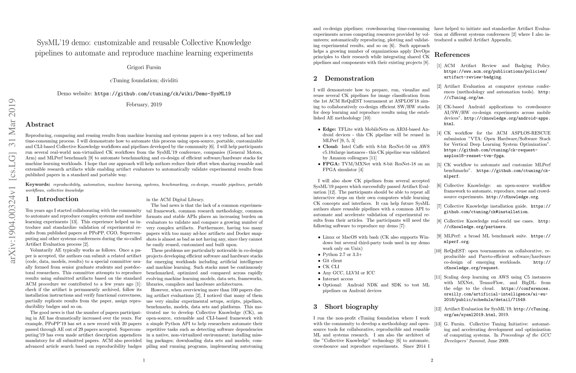 Reproducing, comparing and reusing results from machine learning and systems papers is a very tedious, ad hoc and time-consuming process. I will demonstrate how to automate this process using open-source, portable, customizable and CLI-based Collective Knowledge workflows and pipelines developed by the community. I will help participants run several real-world non-virtualized CK workflows from the SysML'19 conference, companies (General Motors, Arm) and MLPerf benchmark to automate benchmarking and co-design of efficient software/hardware stacks for machine learning workloads. I hope that our approach will help authors reduce their effort when sharing reusable and extensible research artifacts while enabling artifact evaluators to automatically validate experimental results from published papers in a standard and portable way.