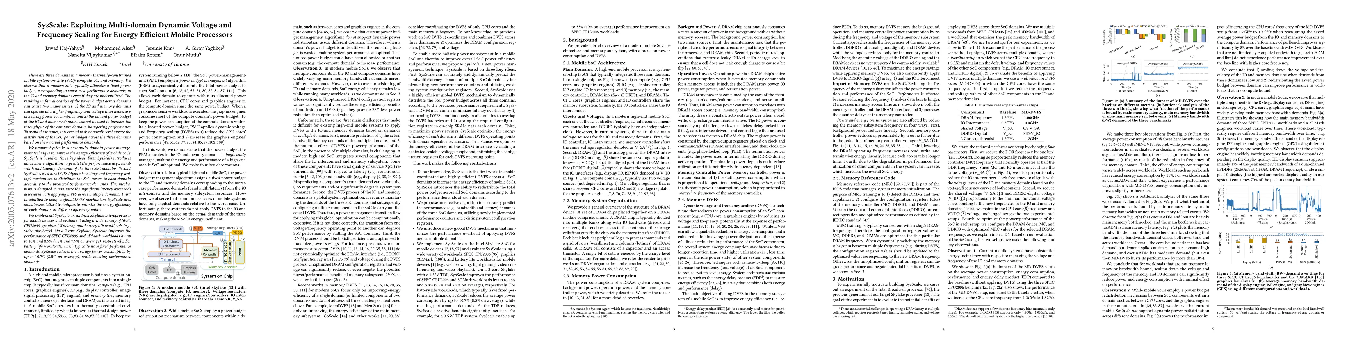 SysScale proposes a multi-domain dynamic voltage and frequency scaling technique to optimize energy efficiency in mobile processors by dynamically allocating power budgets based on actual performance demands, thereby reducing unnecessary power consumption and improving overall performance. Evaluations on Intel Skylake show up to 16% performance improvement in various workloads.